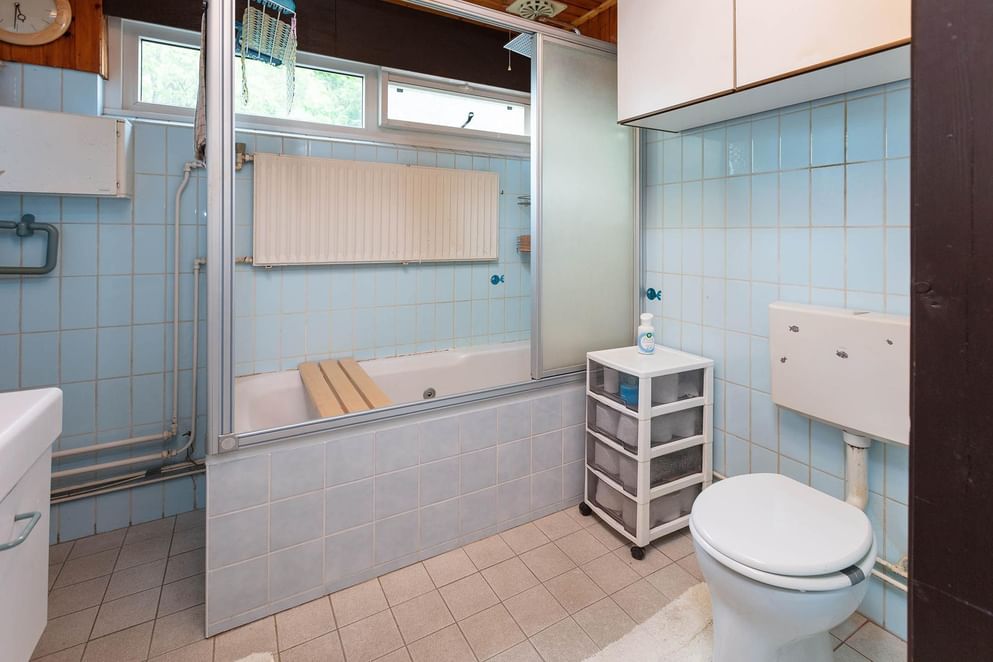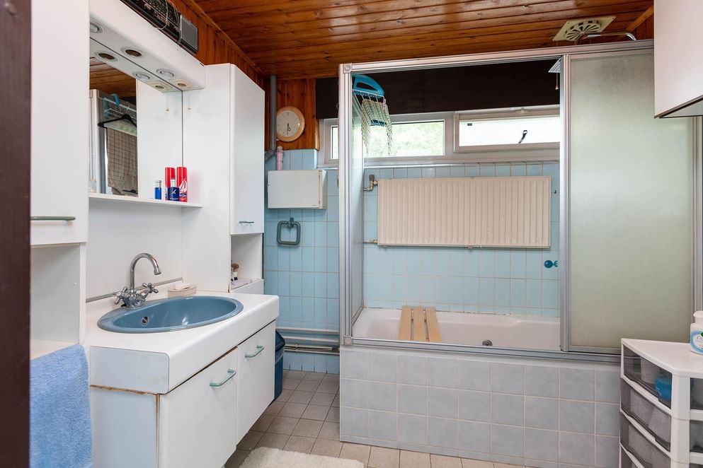 Overloop, drie slaapkamers één voorzien van wastafel, badkamer met douche in bad, toilet en wastafel met meubel.