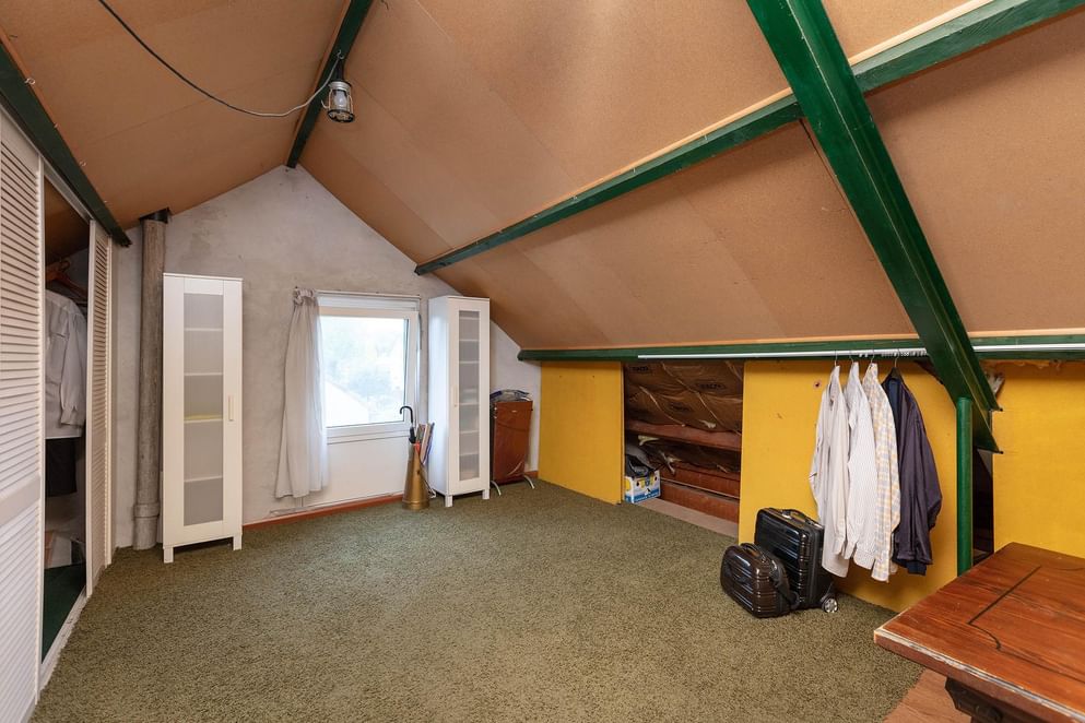 Met vaste trap te bereiken grote zolderruimte met bergruimte achter schotten, cv-opstelling en witgoedaansluitingen.