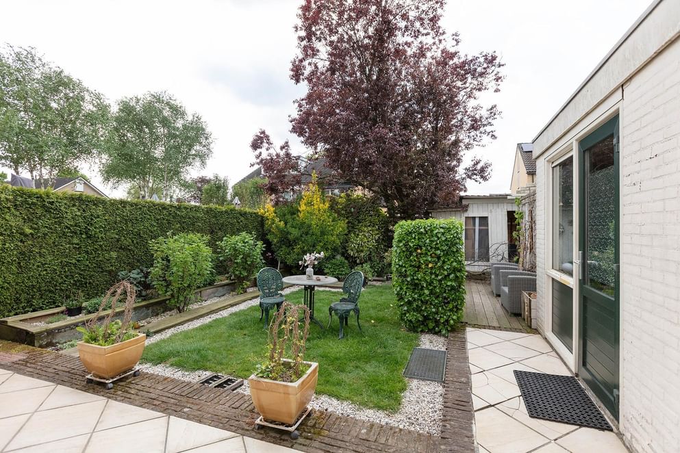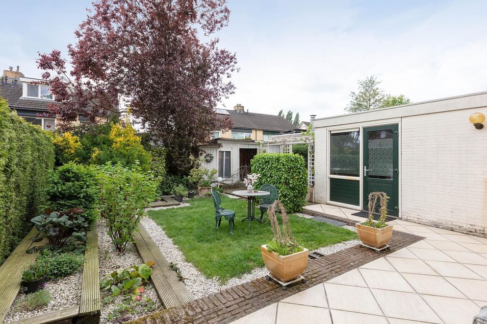 - De achtertuin met houten berging, zonnescherm en achterom heeft een ligging op het Westen