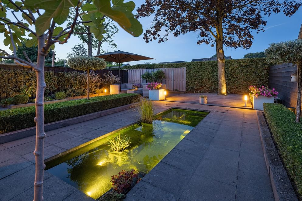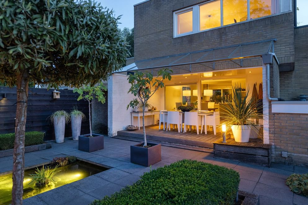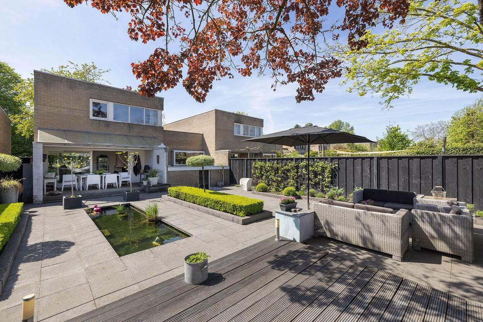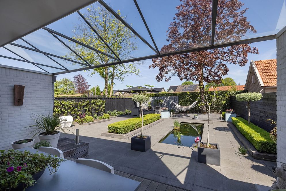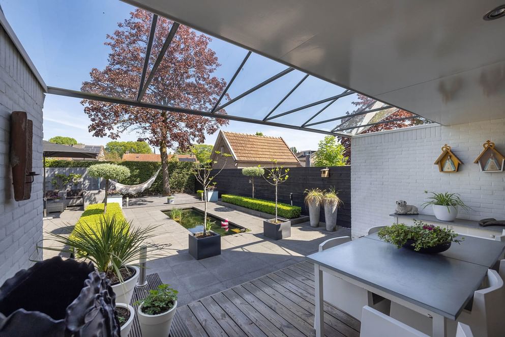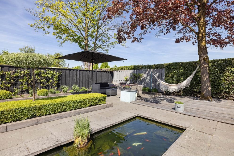 De privacy biedende tuin is via de woning én een achterom bereikbaar (het zijpad is overdekt). De tuin is voorzien van een overdekte veranda en een vijverpartij. Aan de achterzijde bevindt zich een extra stuk grond, momenteel ingericht met gras. Ideaal als plek om de was te drogen of als speelruimte.