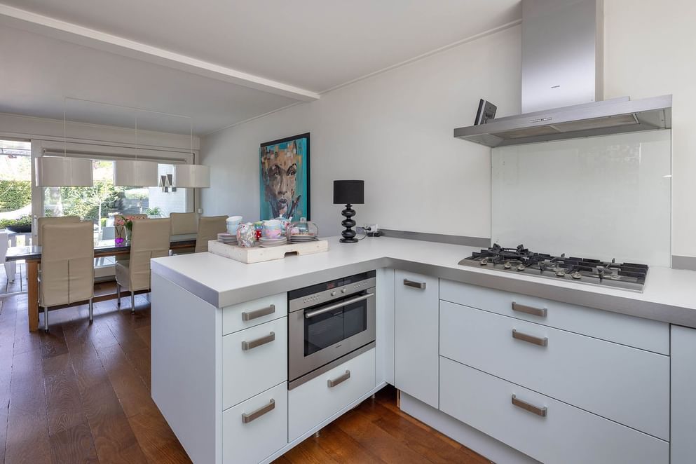 We betreden de woning via de hal, die toegang biedt tot de toiletruimte met wandcloset en fontein, het souterrain en de keuken. De keuken is uitgerust met een gasfornuis, combi-oven, vaatwasser en koelkast. Er is voldoende ruimte voor een royale eethoek. Aangrenzend bevindt zich een tv-hoek met een sfeervolle open haard. Via een grote schuifpui is er toegang tot de verzorgd aangelegde achtertuin. Wanneer we doorlopen naar de woonkamer, wordt de bijzondere architectuur van de woning direct zichtbaar. De trapopgang (split-level) leidt naar royale, privacy biedende woonkamer. Vanuit deze ruimte is, via een tweede trapopgang, de bovenverdieping bereikbaar.