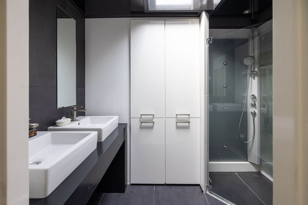 Aan de overloop grenzen drie slaapkamers en de badkamer. De badkamer is voorzien van een dubbele wastafel, douchehoek uitgerust met jets, wandcloset, ingebouwde kast en radiator. De hoofdslaapkamer is gelegen aan de achterzijde van de woning en beschikt over een airconditioning en twee vaste kasten.