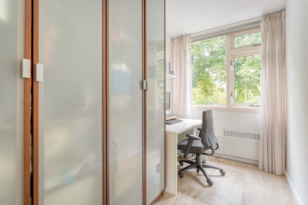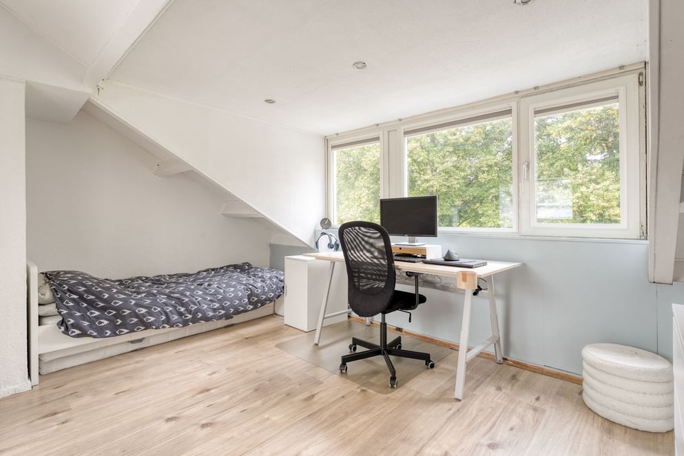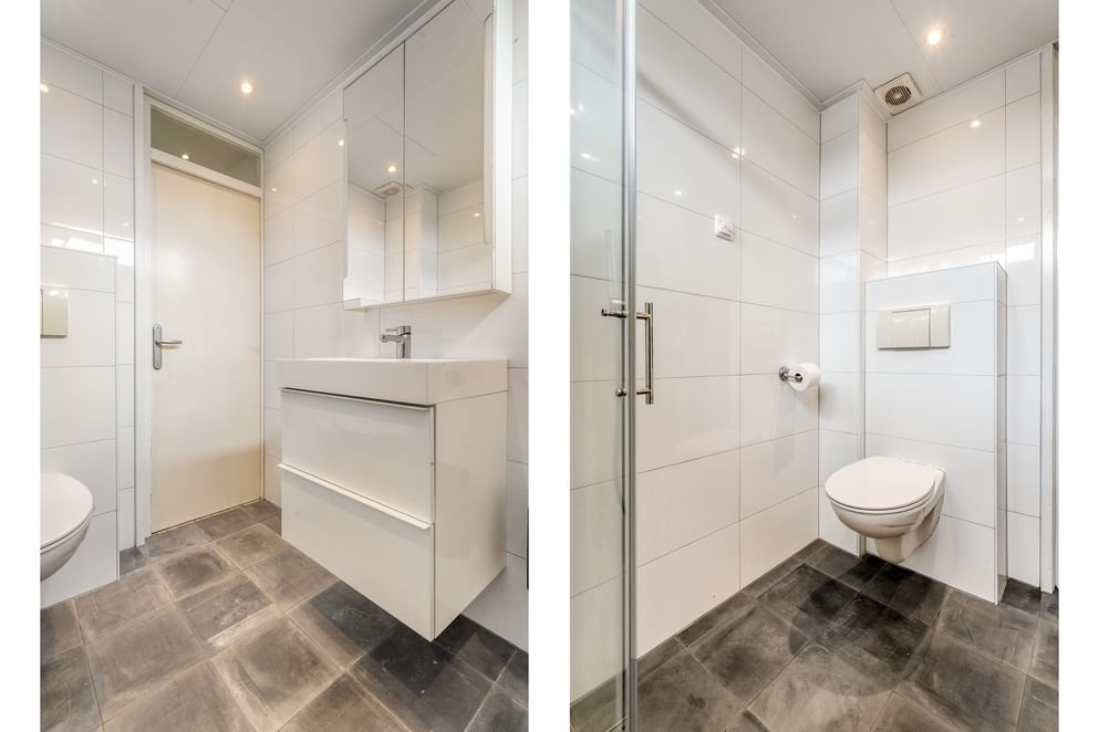 Vanaf de overloop heb je toegang tot twee slaapkamers, elk met grote ramen die zorgen voor veel lichtinval. Daarnaast is er op de eerste verdieping tevens een kleine slaapkamer, die tevens goed dienst kan doen als een werkkamer. De geheel betegelde badkamer is praktisch ingedeeld en voorzien van een toilet, wastafel, douche en elektrische vloerverwarming.