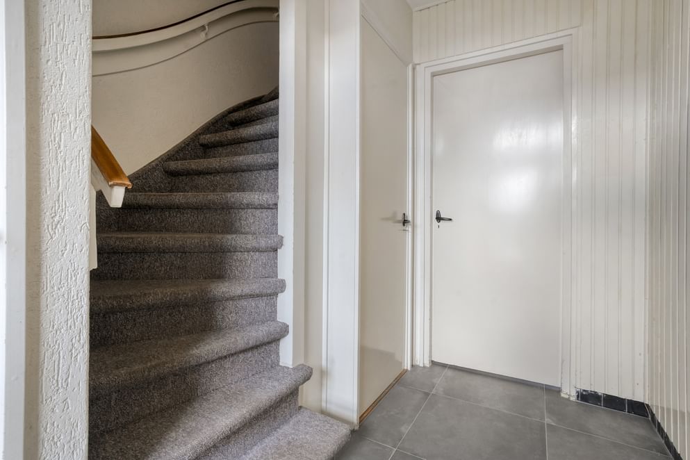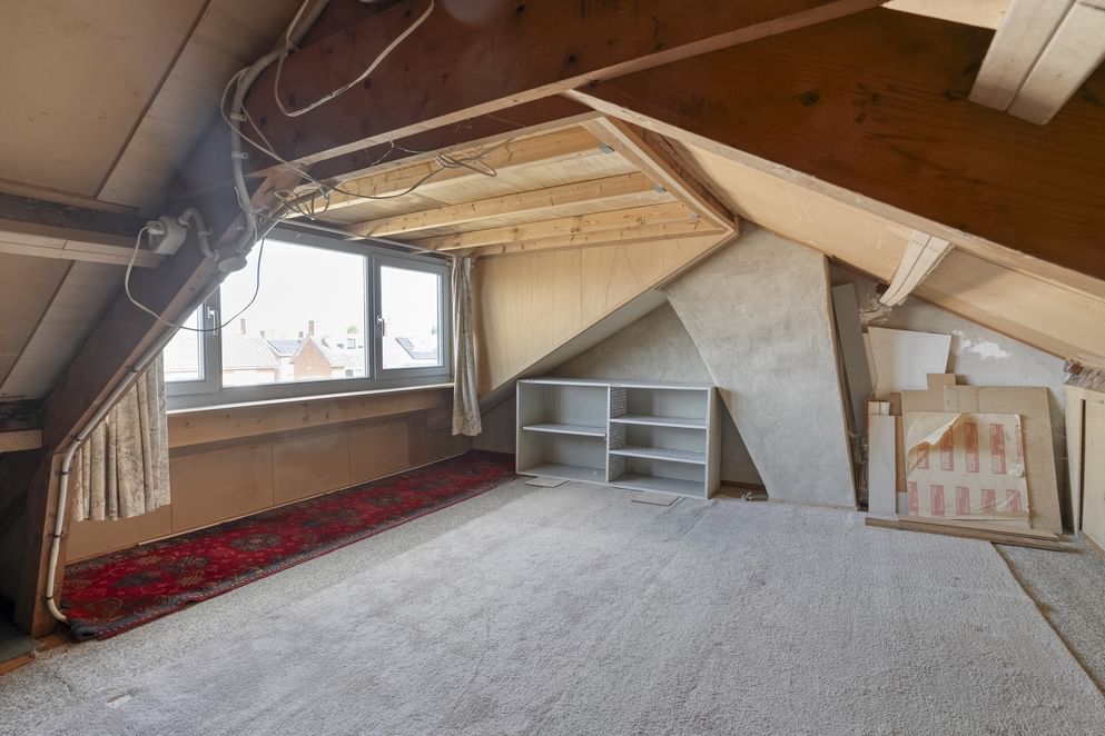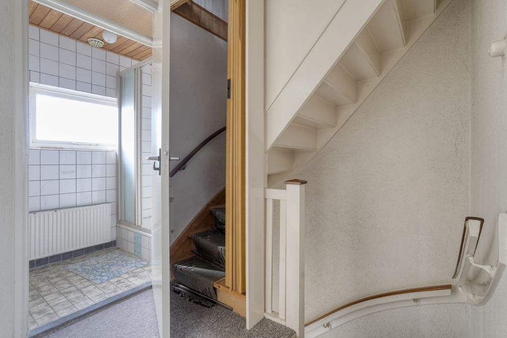 Via een vaste trap is de zolder bereikbaar, ideaal voor het opbergen van spullen en extra opslagruimte.