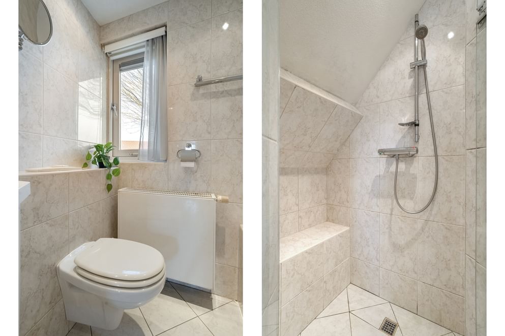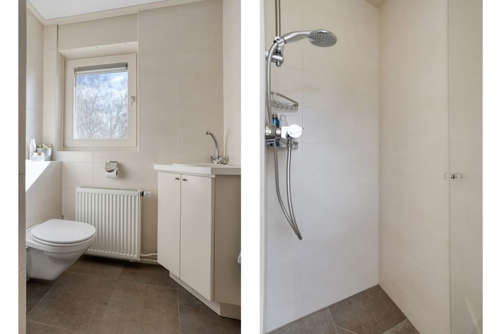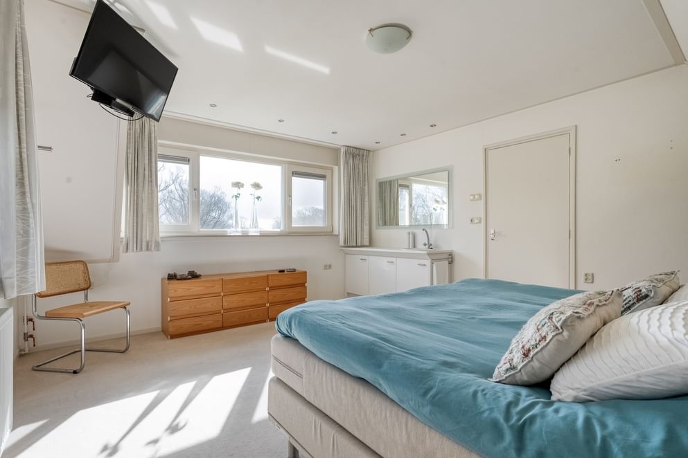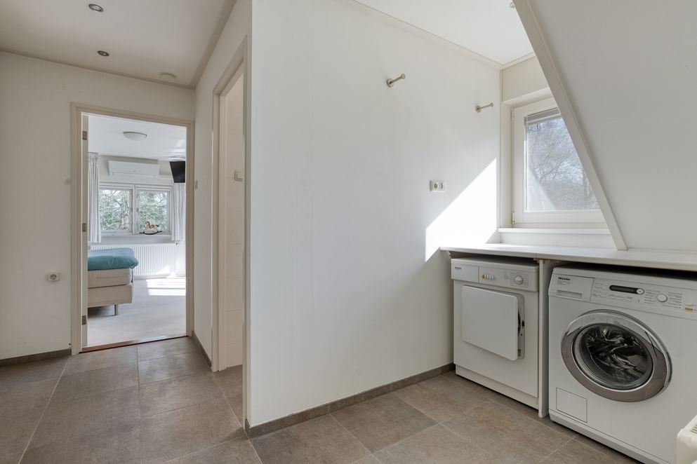 Daarnaast geeft de overloop toegang tot een tweede hal. In deze ruimte is een vaste kastenwand aanwezig en bevinden zich de aansluitingen voor witgoed. Vanuit deze hal zijn de tweede badkamer en de master bedroom te bereiken. De tweede badkamer is uitgerust met een toilet, inloopdouche en wastafel. De master bedroom is ruim opgezet en voorzien van een airco, een wastafel en een dakkapel met rolluiken.
