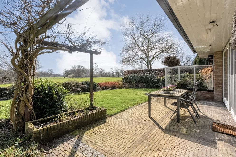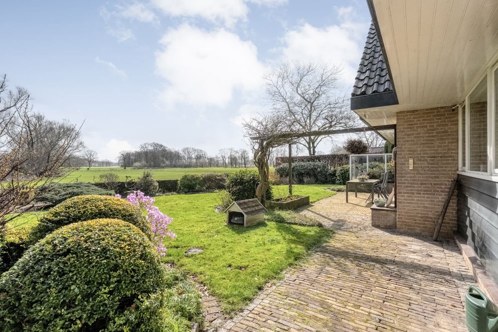 De woning beschikt over een ruime buitenomgeving met een verzorgde voortuin, zijtuin en achtertuin. De royale oprit met carport biedt volop parkeergelegenheid op eigen terrein. Daarnaast is er een vrijstaande garage aanwezig, ideaal voor opslag, het stallen van fietsen of hobbygebruik. De achtertuin is bereikbaar via een achterom en biedt volop ruimte en een prachtig uitzicht, waardoor je hier in alle rust kunt genieten van het buitenleven.