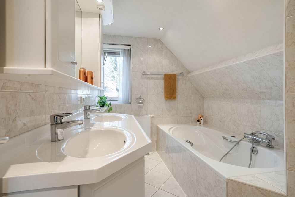 Vanaf de overloop zijn twee slaapkamers, een badkamer en de stookruimte bereikbaar. De badkamer is voorzien van een whirlpool, toilet, dubbele wastafel met meubel, een inloopdouche en vloerverwarming. Eén van de slaapkamers beschikt over een wastafel, terwijl de andere kamer directe toegang biedt tot de loggia. Ook vanaf de overloop is de loggia bereikbaar en hier bevindt zich tevens een vaste kast.