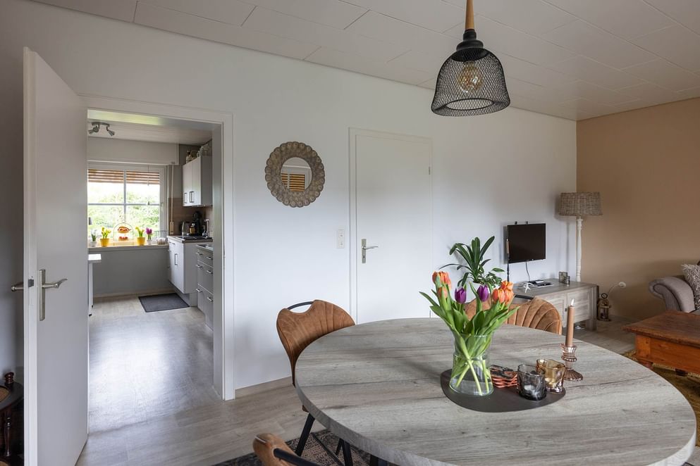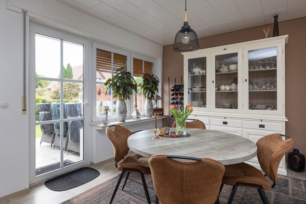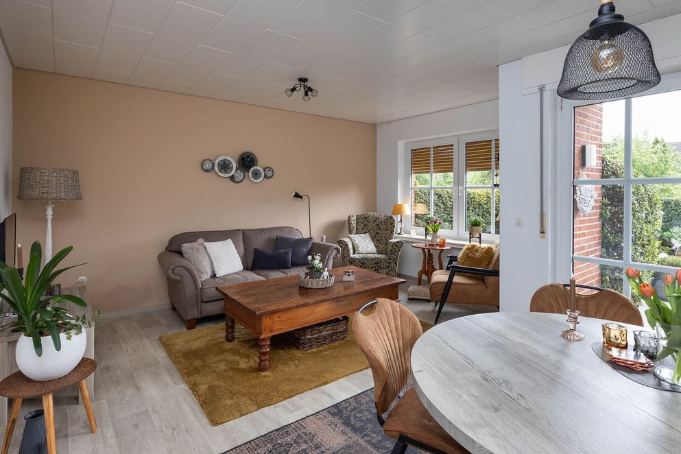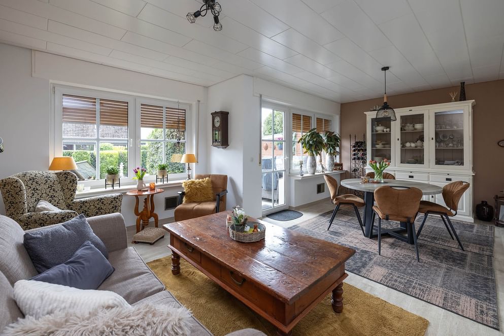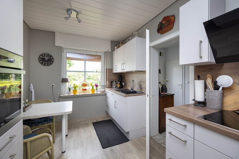 Via de centrale hal, met trapopgang naar de eerste verdieping, bereikt u een volledig betegelde doucheruimte, voorzien van toilet, douche, wastafel en mechanische afzuiging. Aan de voorzijde bevindt zich de ruime woonkeuken met een moderne keukenopstelling (2020) in mat gebroken wit met een stijlvol houtlook werkblad. De keuken is uitgerust met hedendaagse apparatuur, waaronder een inductiekookplaat, design afzuigkap, oven, vaatwasser en dubbele koelkast. Aan de achterzijde ligt de lichte, tuingerichte woonkamer. Dankzij de royale raampartijen geniet u hier van een mooi zicht op de achtertuin. Via de loopdeur stapt u zo het terras op. De woonkamer biedt voldoende ruimte voor zowel een royale eettafel als een sfeervol zitgedeelte.