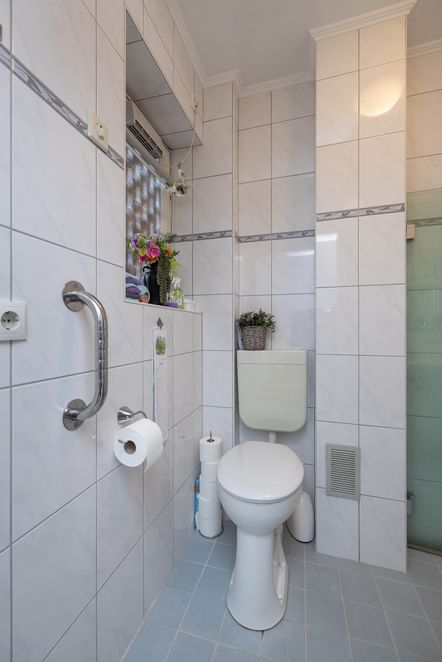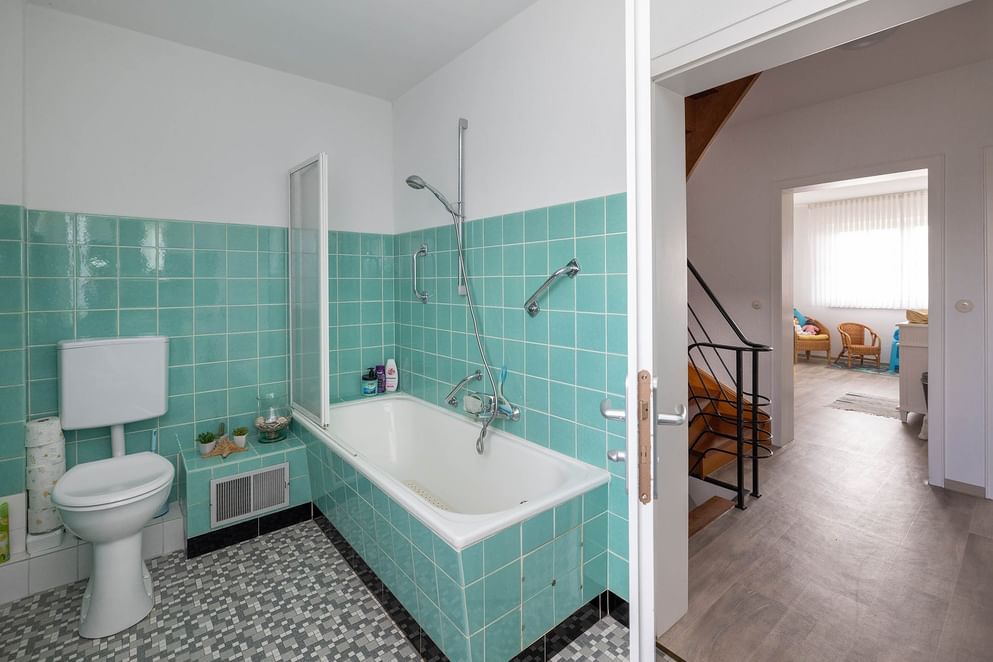 Op de overloop heeft u toegang tot drie slaapkamers van prettig formaat. Eén van de kamers aan de achterzijde beschikt over een eigen loggia, een heerlijke plek om buiten te zitten. De badkamer is uitgevoerd in een aquablauwe en grijze kleurstelling en voorzien van een ligbad met douche, toilet, wastafel en aansluiting voor de wasmachine.
