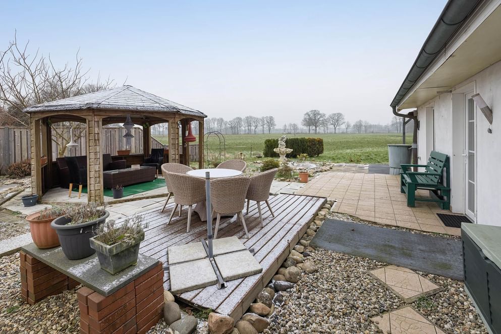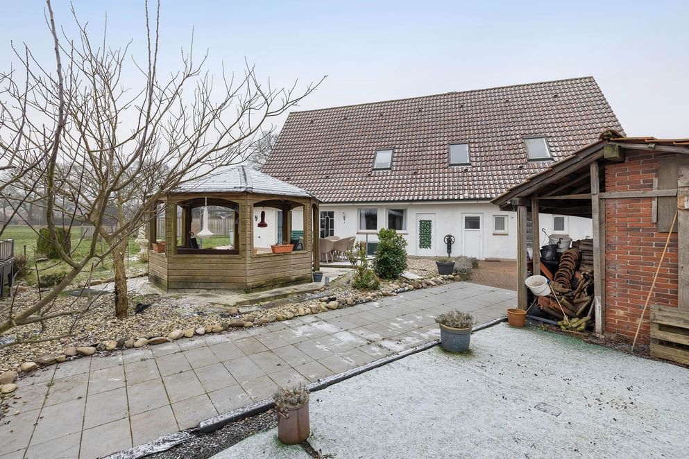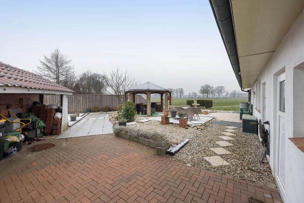 De woning staat op een riant perceel van 995 m² met meerdere terrassen, een tuin met vrij uitzicht over de velden. Daarnaast biedt de ruime oprit plaats aan meerdere auto’s en beschikt het perceel over vier kleine schuurtjes en een vrijstaande garage. Met 12 zonnepanelen is het huis bovendien deels zelfvoorzienend in energie.