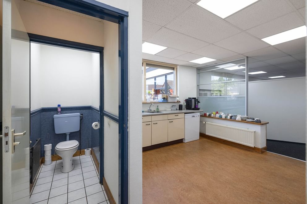- Begane grond: entree v.v. balie en meterkast, 2x kantoorruimte, spreekkamer, kantine v.v. keukenblok, toiletruimte, werkplaats, magazijn.