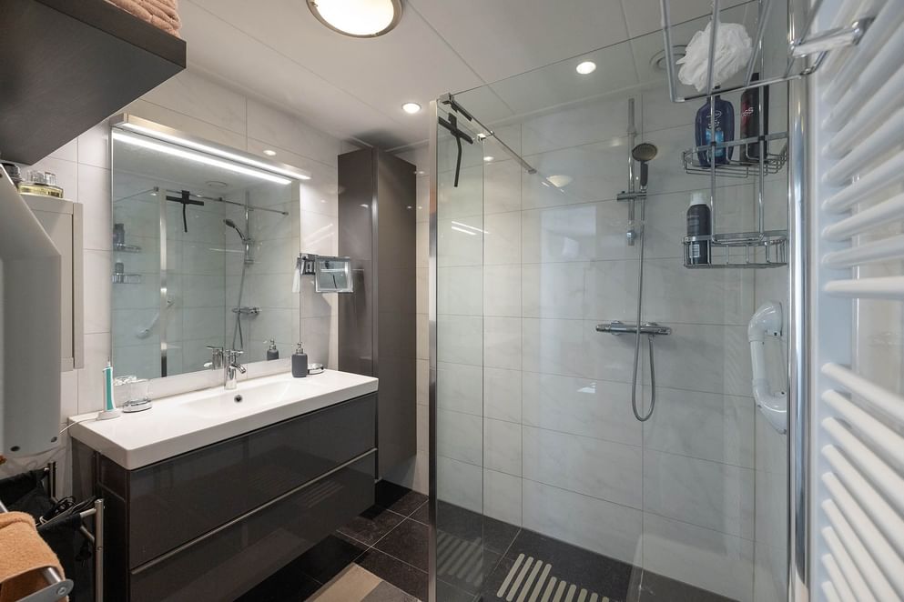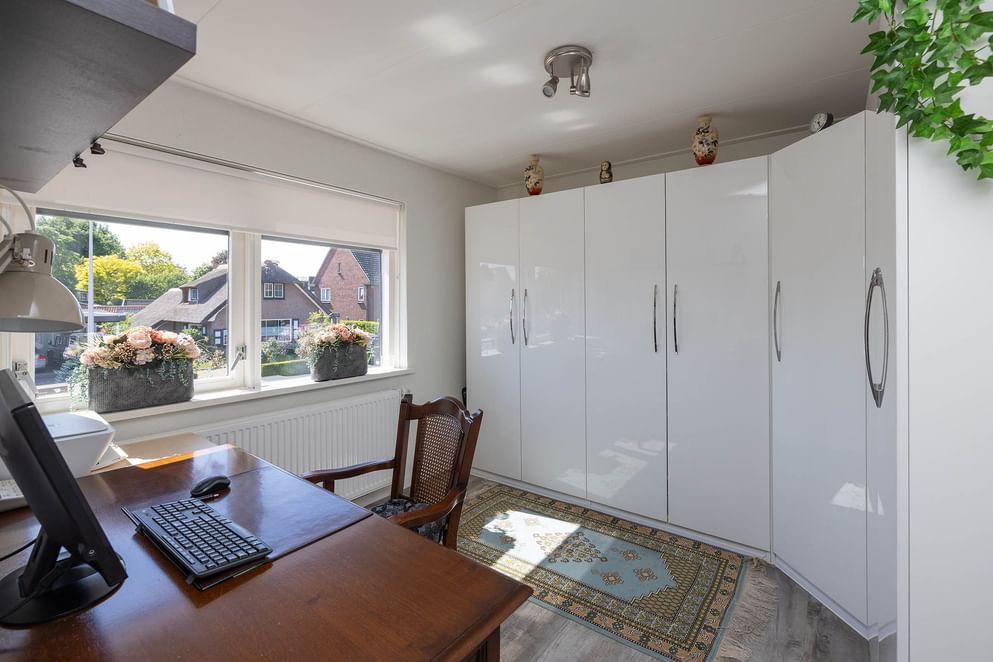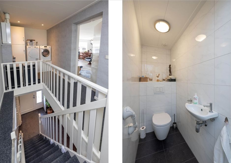 - Eerste verdieping: overloop, toiletruimte v.v. toilet en fontein, woonkamer v.v. screens en TV-meubel, keuken v.v. vaatwasser, inductiekookplaat, RVS-schouw, slaapkamer I v.v. kastenwand, slaapkamer II, badkamer v.v. badmeubel, douchehoek, design radiator, vloerverwarming, bijkeuken v.v. aansluiting wasmachine en droger op hoogte, opstelplaats CV-installatie (Intergas HRE 2015), ruim overdekt terras v.v. glazen schuifwand, zolderruimte geschikt als kantoor-/bergruimte.