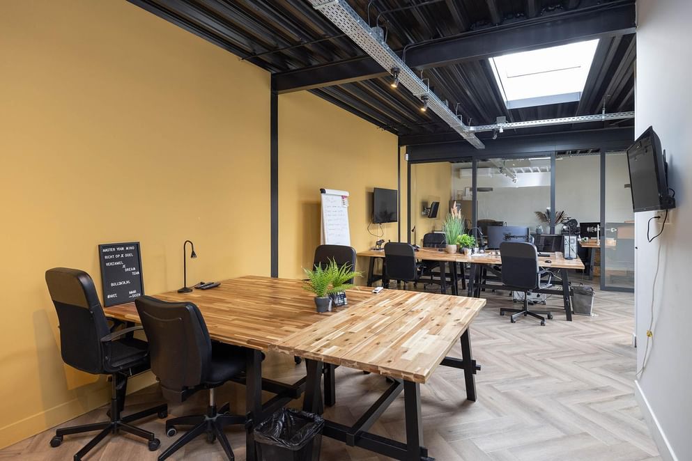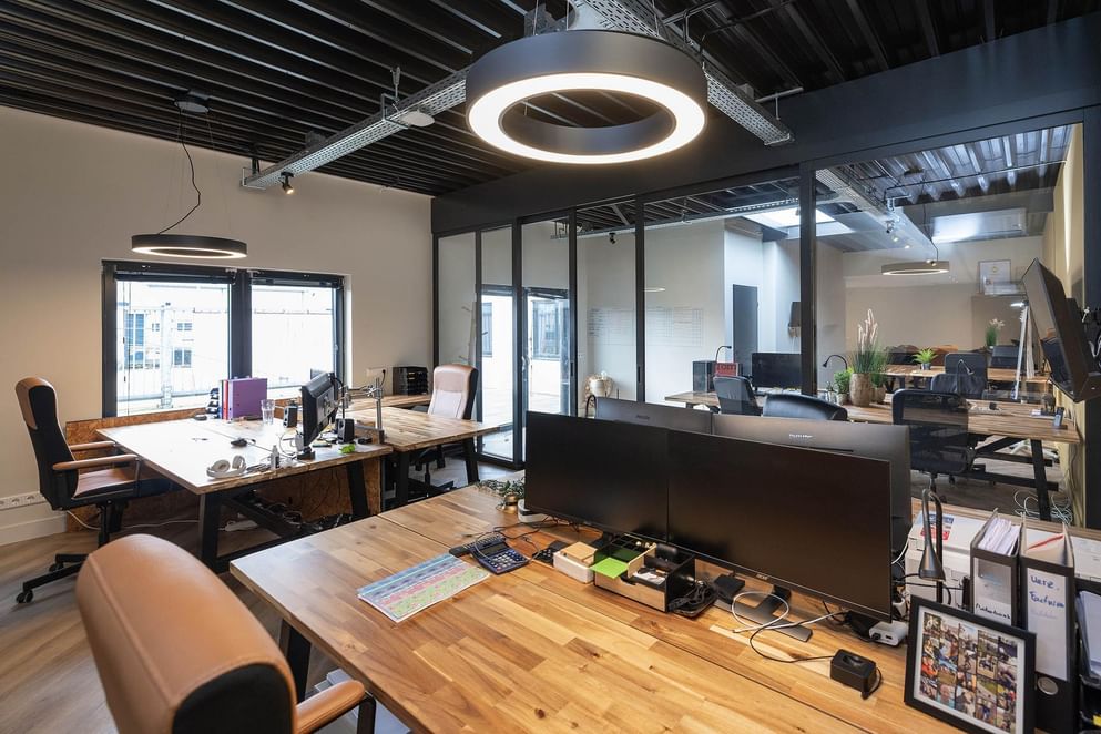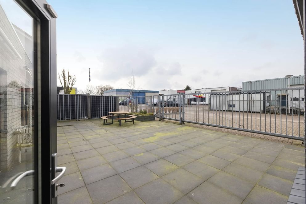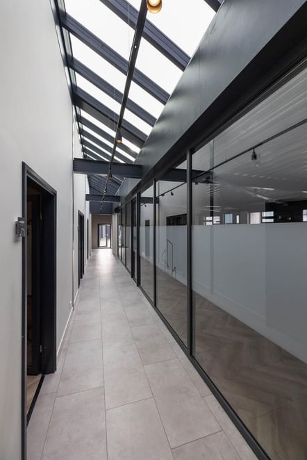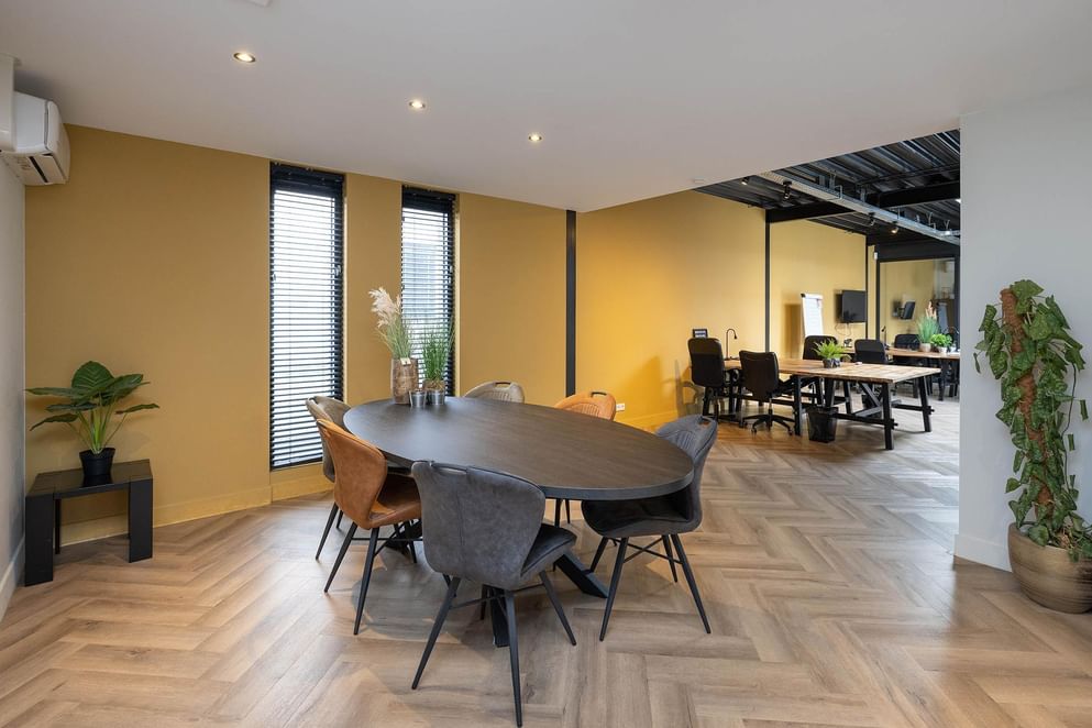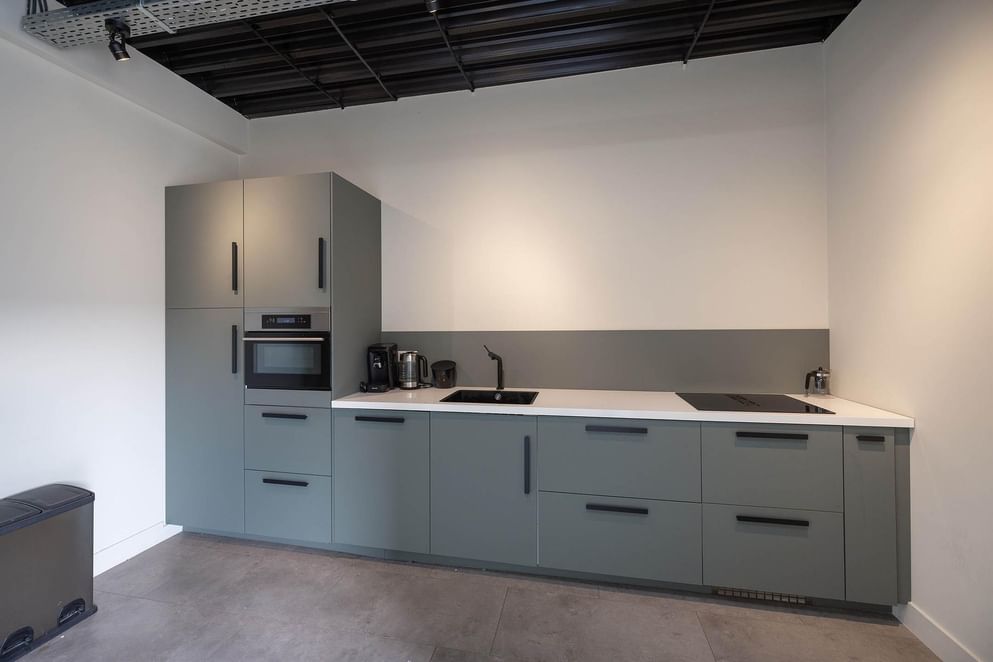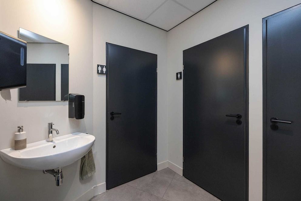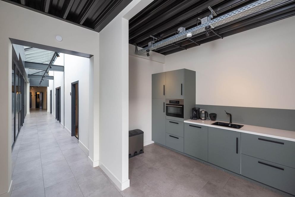 De entree, pantry en toiletten worden gedeeld. Aan de achterzijde is de toegang tot de kantoorruimte. Een hoogwaardig afgewerkte ruimte met veel natuurlijk licht door de raampartijen.