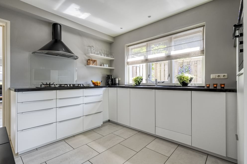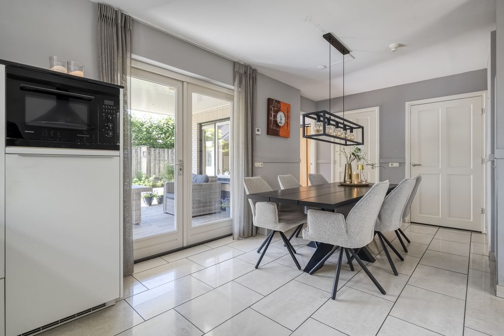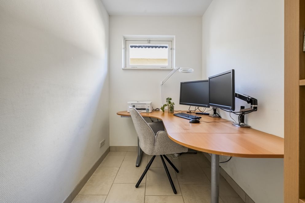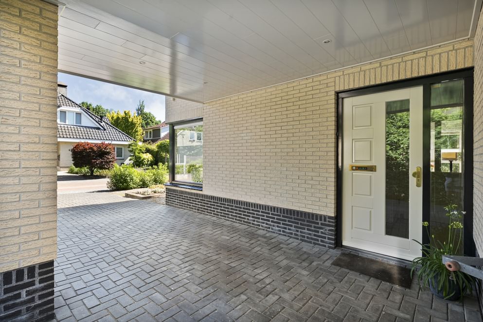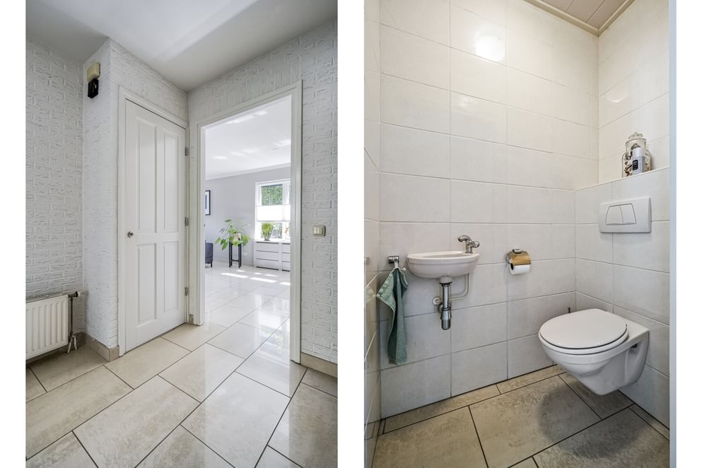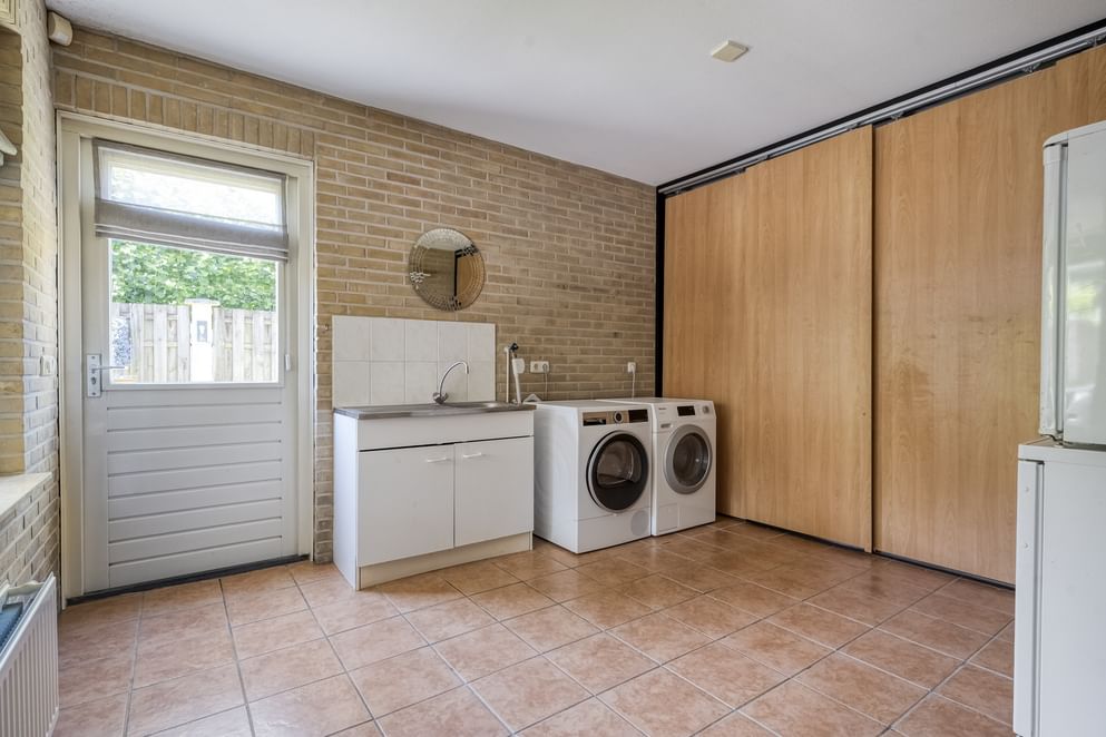 Via de oprit bereik je de carport en de overdekte entree. In de hal bevinden zich het toilet en de trapopgang. De ruime woonkamer is opvallend licht dankzij brede raampartijen en ligt in open verbinding met de leefkeuken. Liever afgesloten koken? Een schuifdeur scheidt beide ruimtes in één beweging. De keuken is praktisch ingedeeld met een groot werkblad en veel kastruimte en geeft via dubbele tuindeuren toegang tot het overdekte terras. Aansluitend ligt de bijkeuken met witgoedaansluitingen. Daarachter vind je een royale berging (eigen entree via achterom) en een ruime kamer die nu als kantoor dient. Ideaal voor werk, hobby of alternatieve indeling. Daarnaast beschikt de woning over een kelder, perfect als wijn- of voorraadkelder.