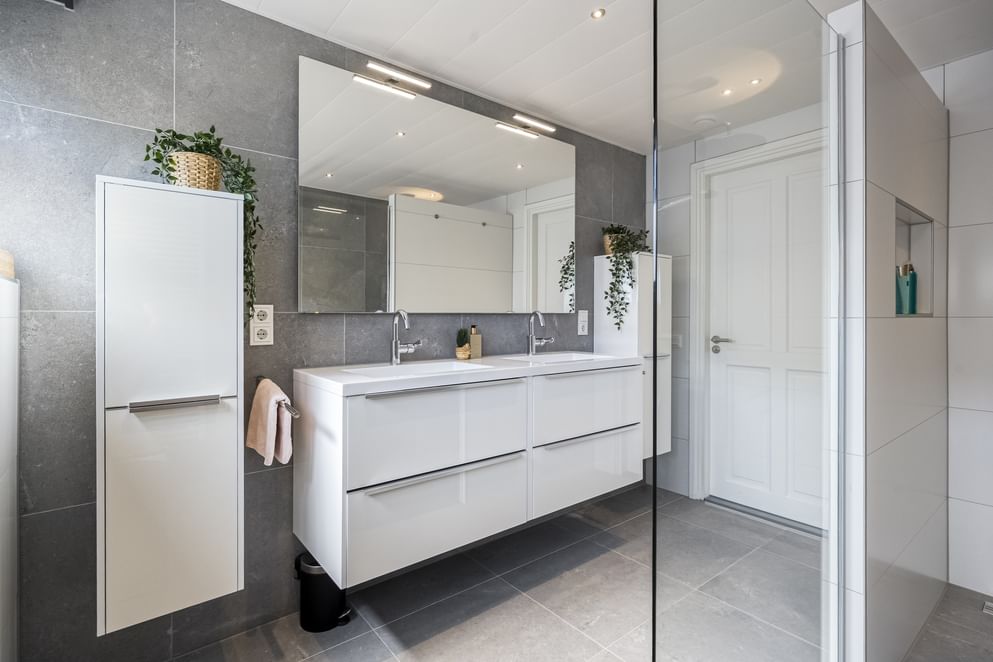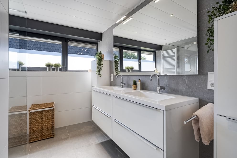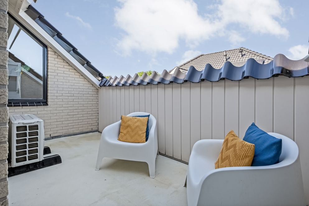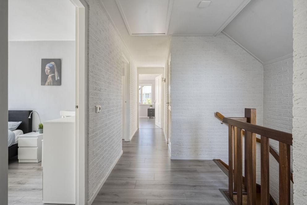 Boven kom je uit op de overloop waar de airco tijdens warme dagen voor verkoeling zorgt. Rechts vind je de grote slaapkamer: een serene, ruime kamer met inloopkast en een loggia waarop de laatste zonnestralen binnenvallen. Verder zijn er drie extra slaapkamers, ideaal voor kinderen, gasten of een hobby, waarvan één kamer directe toegang heeft tot de tweede loggia op de avondzon. De badkamer uit 2021 voelt als een mini spa dankzij de ruime inloopdouche, vloerverwarming en dubbele wastafel. Een apart toilet en slimme bergruimte achter de knieschotten maken de verdieping compleet.