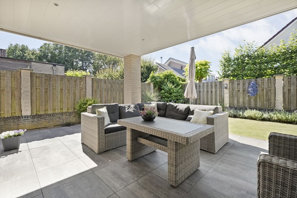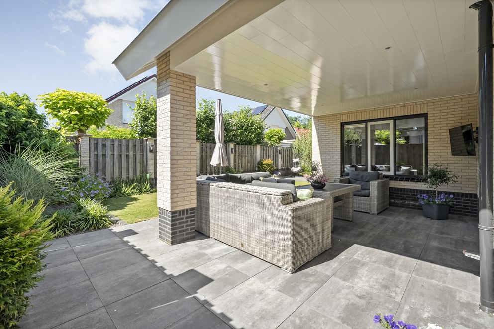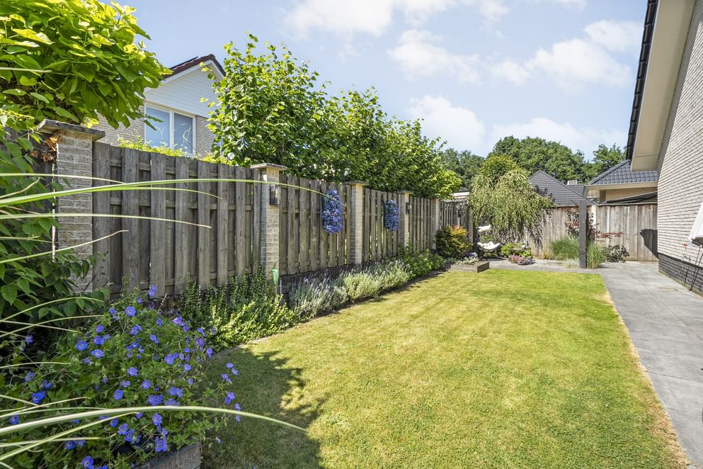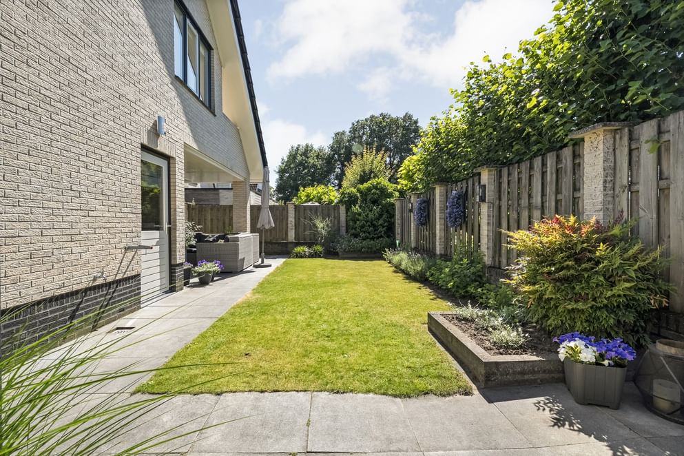 De achtertuin is fraai aangelegd met sierbestrating, borders en een strak gazon. Dankzij de ligging op het noordwesten geniet je ’s middags en ’s avonds van de zon. Het overdekte terras verlengt je buitenseizoen en de houten schutting op stenen onderbouw biedt volop privacy. De tuin is via een achterom te bereiken.