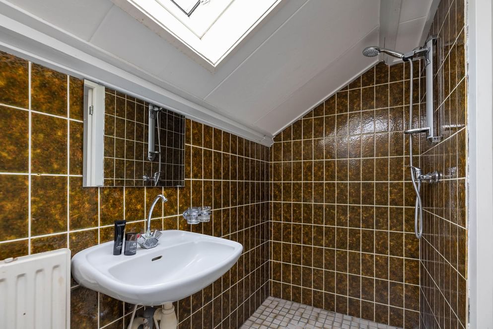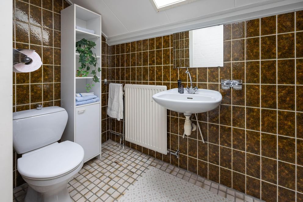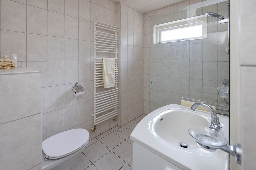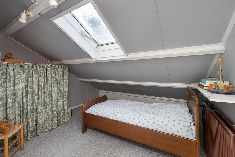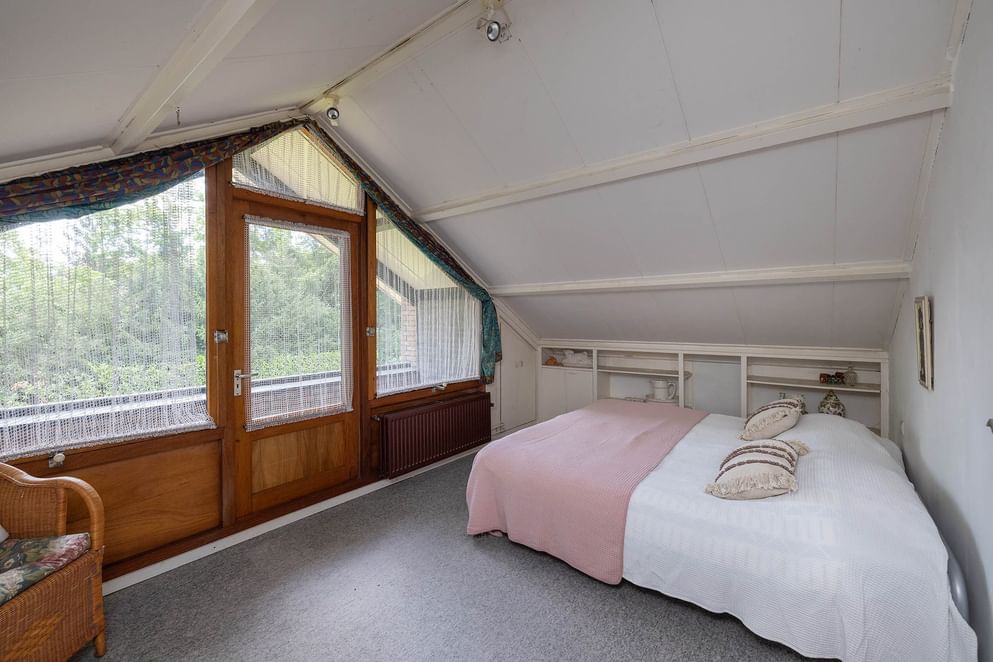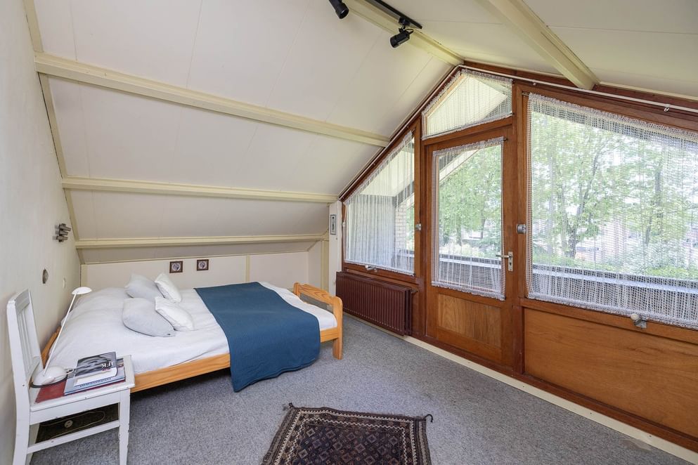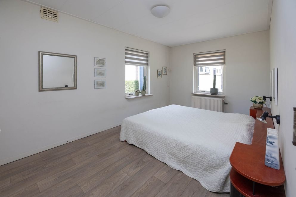 Aan de andere zijde van de woning bevindt zich het slaapgedeelte op de begane grond. Hier vind je een ruime slaapkamer, een badkamer met douche, toilet en wastafel. Deze opzet maakt de woning zeer geschikt voor levensloopbestendig wonen.