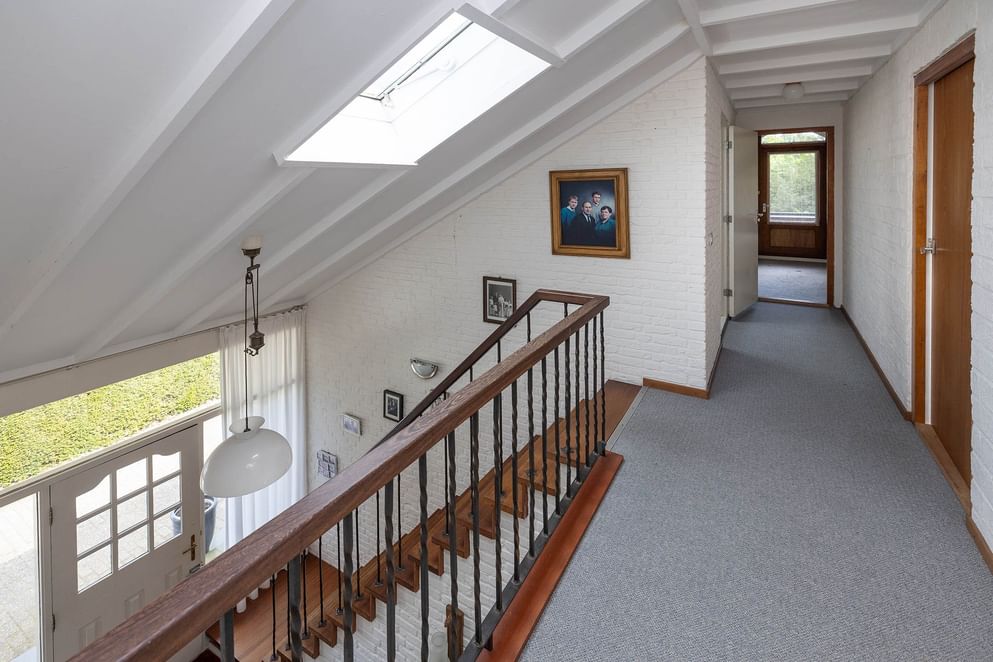 De trap in de hal leidt naar de eerste verdieping, waar zich twee royale slaapkamers en een extra (derde) kleinere kamer bevinden, ideaal als logeerkamer, kantoor of hobbyruimte. Op deze verdieping zijn ook twee loggia’s aanwezig, grenzend aan de twee ruime slaapkamers, die zorgen voor extra licht, buitengevoel en de mogelijkheid om beschut van het uitzicht te genieten. Daarnaast is er een tweede badkamer en zijn er meerdere bergruimtes achter de knieschotten.