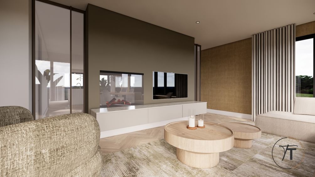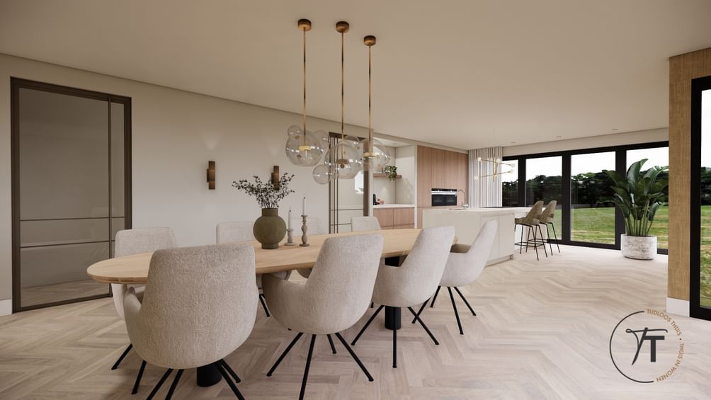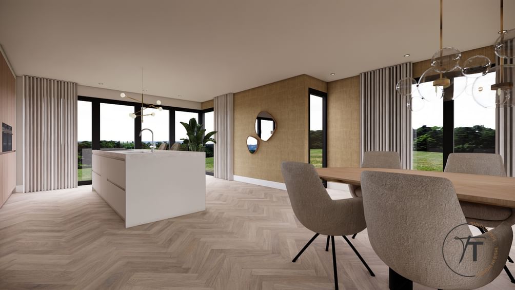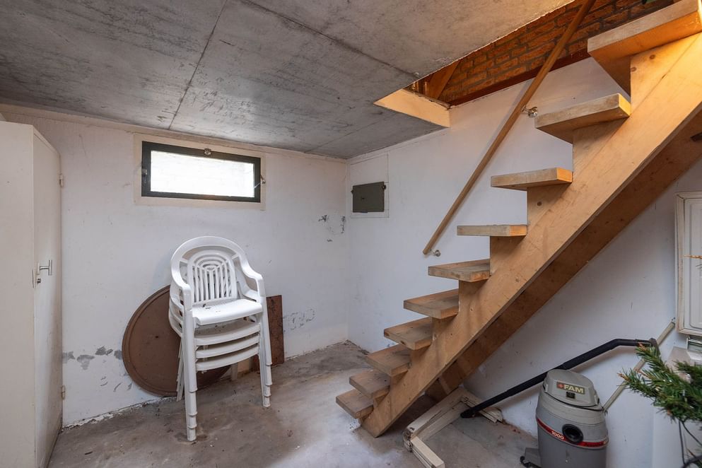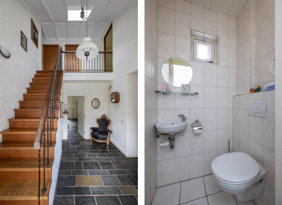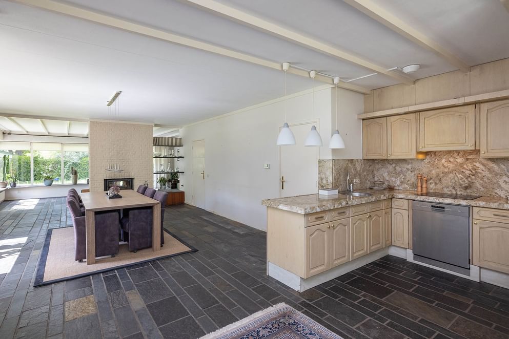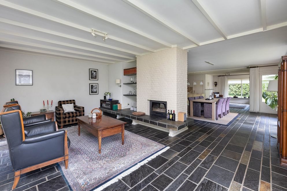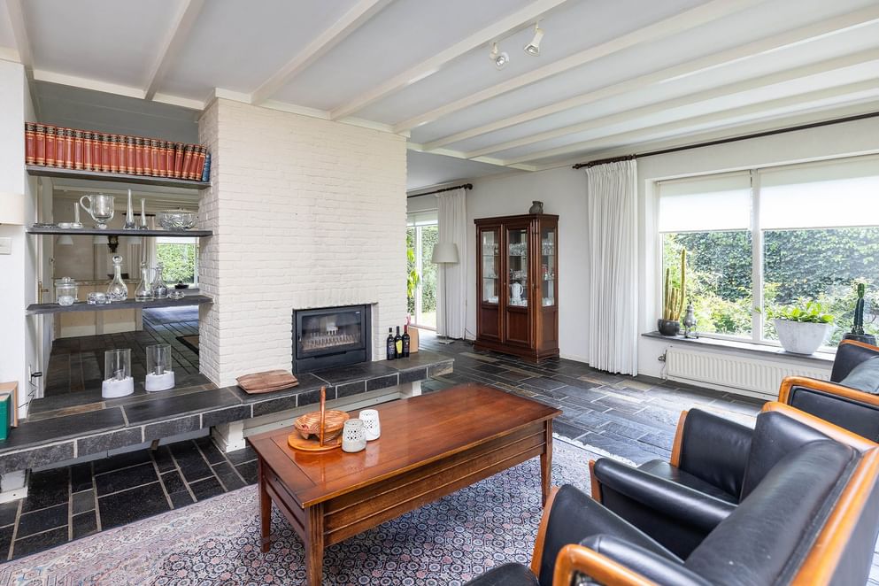 Via de overdekte entree kom je in de ruime hal met vide, die direct opvalt door het vele daglicht. Vanuit de hal zijn alle belangrijke vertrekken bereikbaar: de royale woonkamer, het slaapgedeelte, de kelder, de werkkamer en het toilet. De woonkamer is ruim en licht, met grote raampartijen en zicht op de tuin aan meerdere zijden. De indeling is speels dankzij de roomdivider met open haard, die de zit- en eetkamer op een natuurlijke manier van elkaar scheidt. De woonkamer loopt over in de halfopen keuken, voorzien van eenvoudig keukenblok, met toegang tot de bijkeuken. Deze praktische ruimte biedt plaats aan wasmachine, opslag en heeft een deur naar de achtertuin.