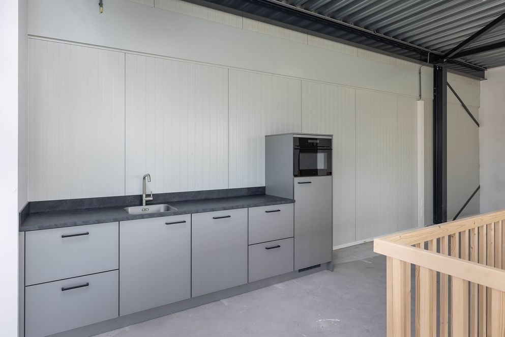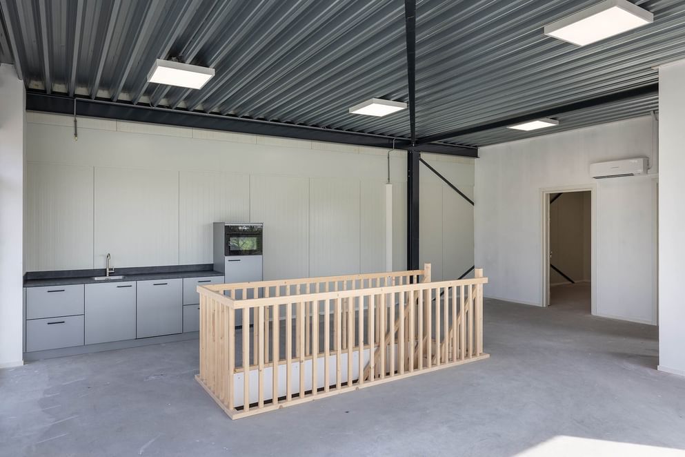 - Eerste verdieping (ca. 105 m²): v.v. betonvloer, keukenblok met oven en wasbak, driemaal kantoorruimte. De gehele bovenverdieping is voorzien van airconditioning die zowel kunnen koelen als verwarmen.