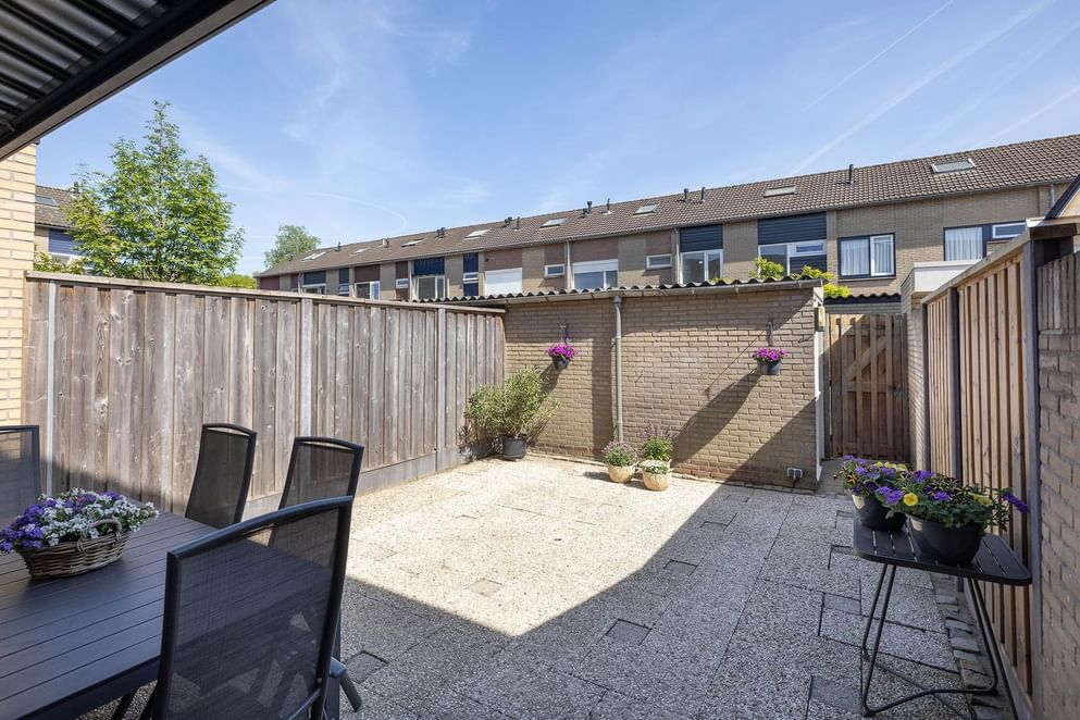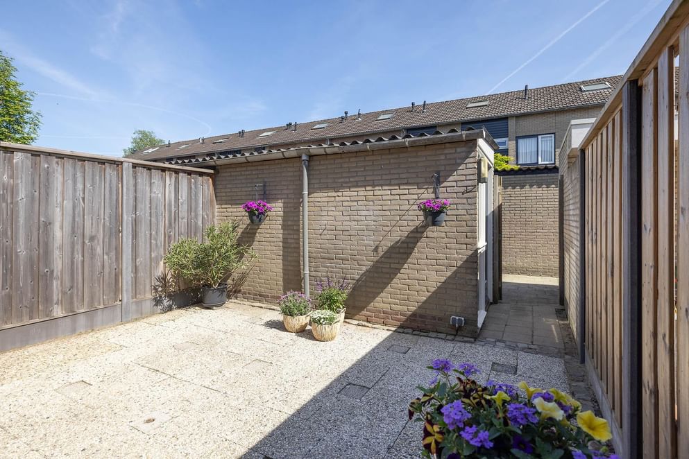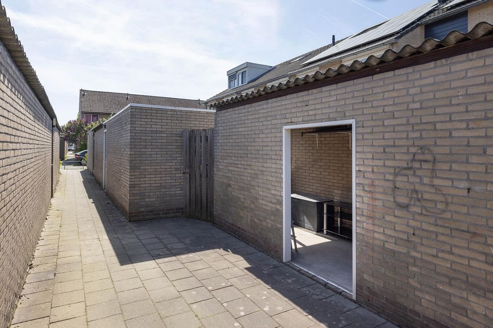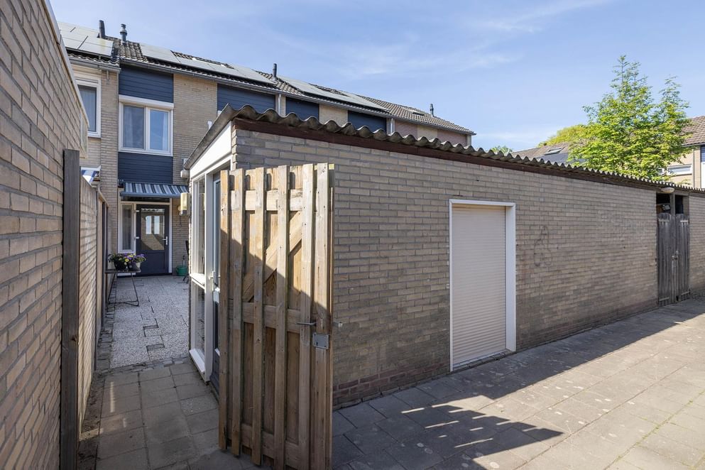De tuin op het zuidoosten heeft de hele dag door zon en beschikt over een elektrisch zonnescherm. Achterin de tuin staat een vrijstaande stenen berging met elektra. De achtertuin is middels een poort te bereiken, en via het pad loop of fiets je naar de voorkant van de woning.