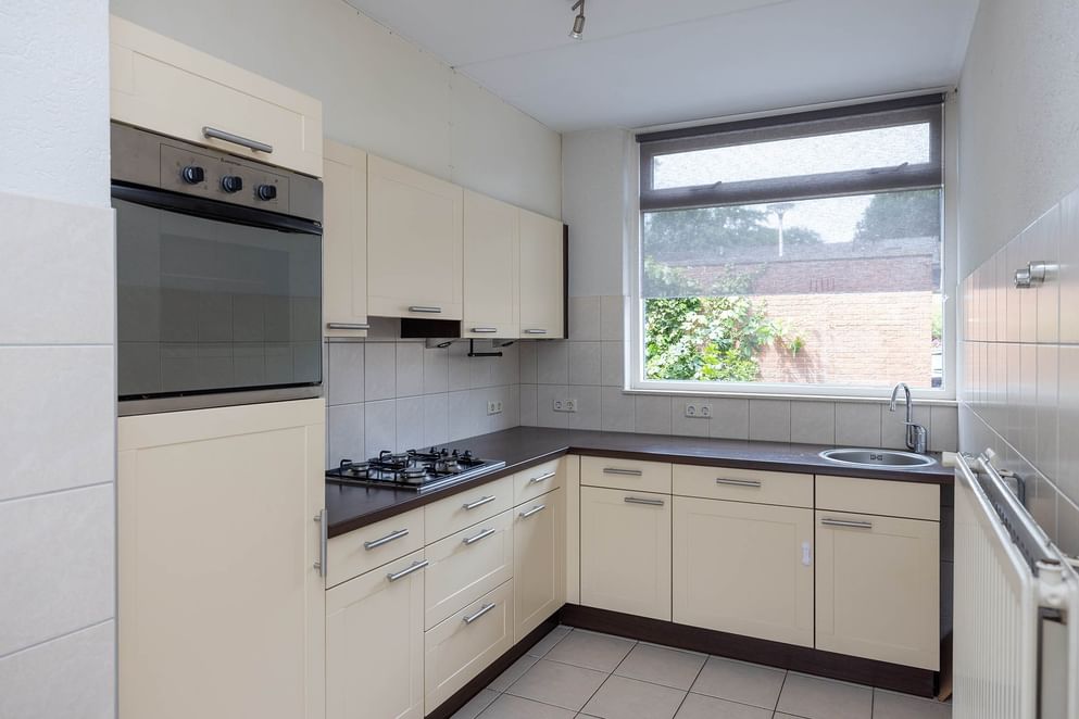 Je betreedt de woning via de hal, waar zich het toilet met fonteintje, de meterkast en de trap naar de eerste verdieping bevinden. Vanuit de hal loop je door naar de lichte en ruime woonkamer. Dankzij het grote raam aan de achterzijde is hier veel natuurlijk daglicht. Aan de voorzijde van de woning ligt de open keuken in L-opstelling. Deze is uitgerust met inbouwapparatuur zoals een rvs-spoelbak, een 4-pits gaskookplaat met afzuigkap, een koelkast, een vaatwasser en een oven.