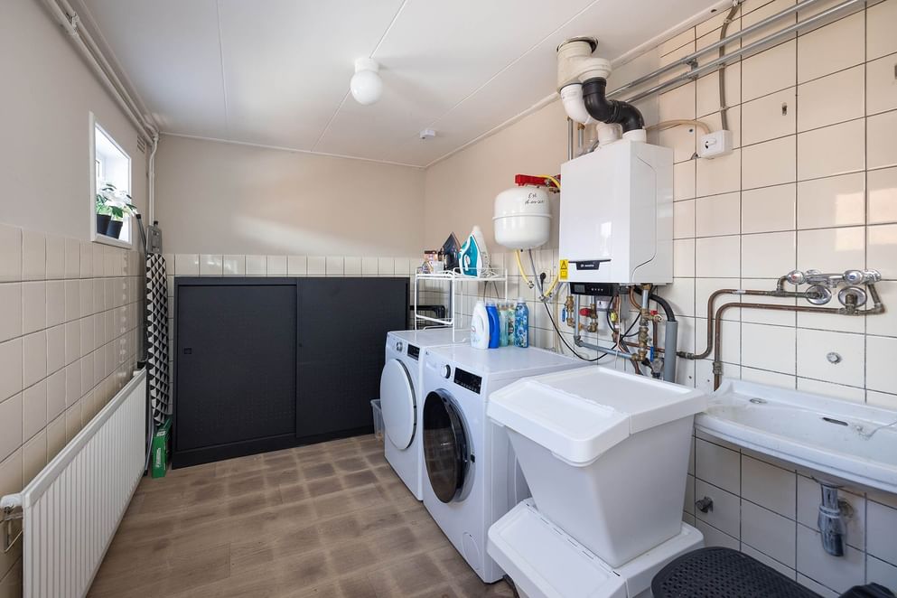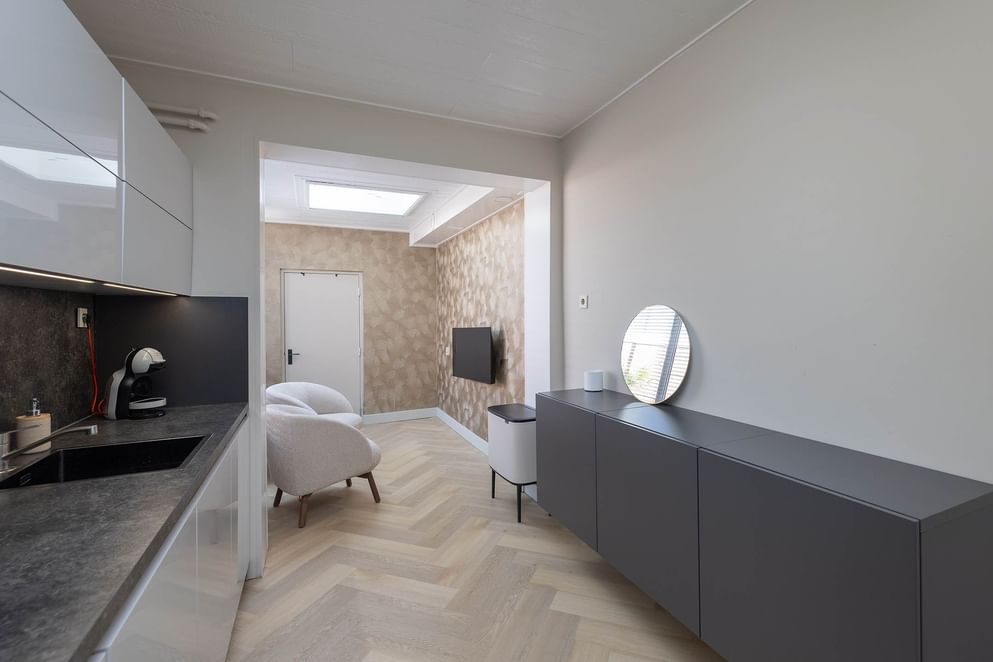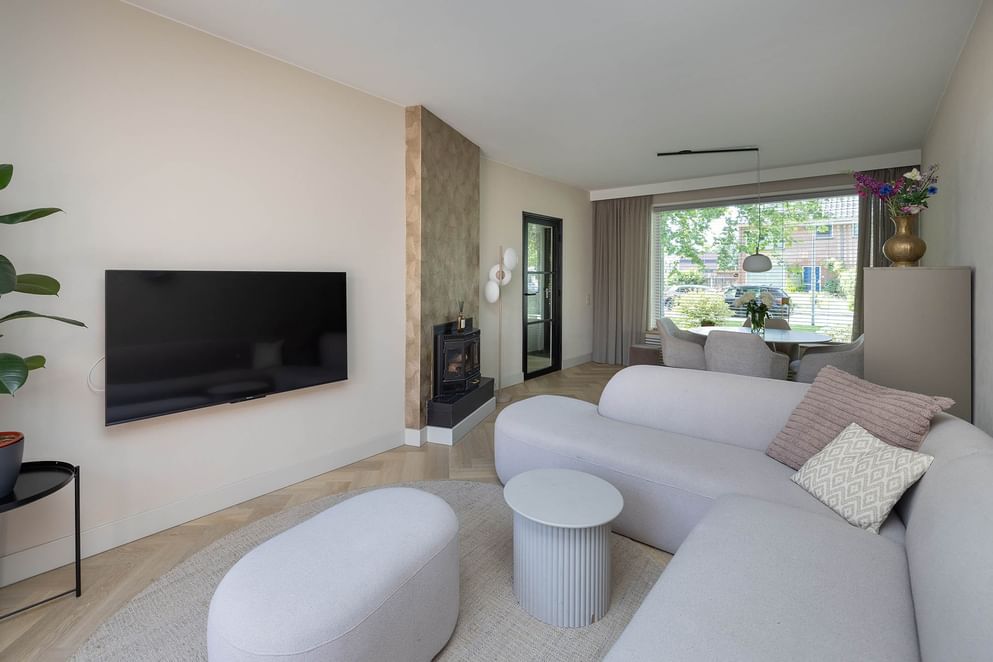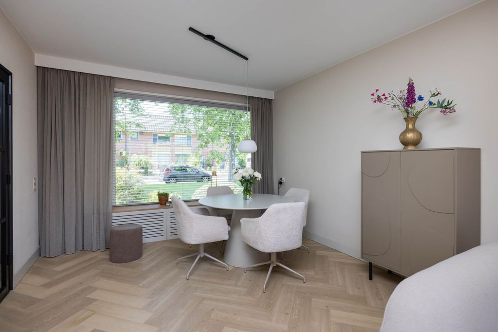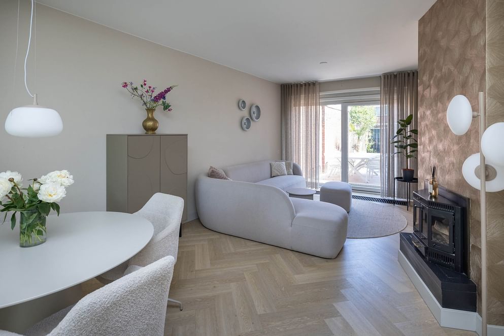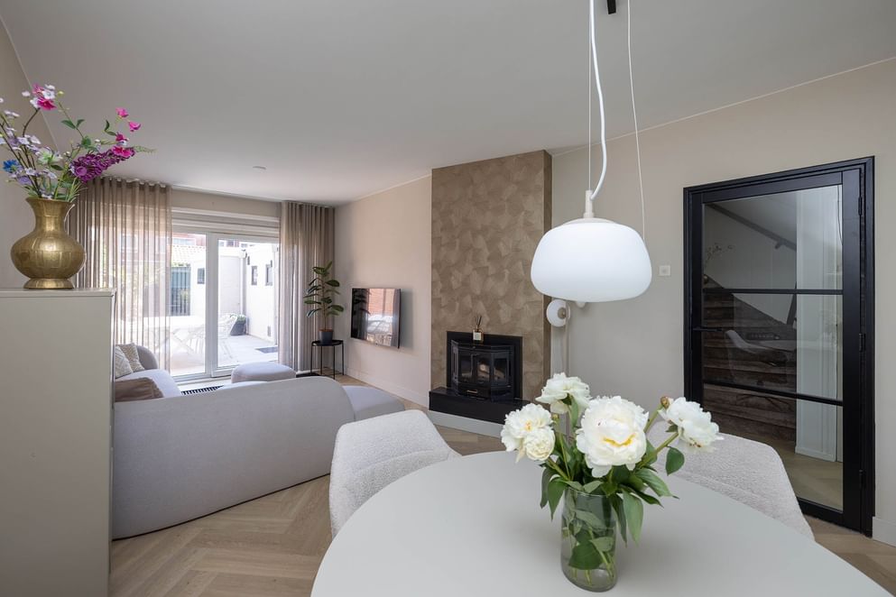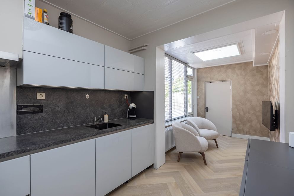Bij binnenkomst betreed je de woning via een verzorgde entree/hal met meterkast, trapopgang en een moderne toiletruimte voorzien van een wandcloset en fontein. De ruime, strak afgewerkte woonkamer straalt een eigentijdse sfeer uit, mede dankzij de grote raampartijen die zorgen voor veel natuurlijk licht. Een sfeervolle gaskachel en een schuifpui naar de zonnige achtertuin maken deze ruimte compleet. De in 2020 vernieuwde keuken is een echte blikvanger en uitgerust met moderne inbouwapparatuur, waaronder een inductiekookplaat, vaatwasser, combi-oven, koelkast en afzuigkap. Vanuit de keuken heb je toegang tot de bijkeuken, die voorzien is van een praktische uitstortgootsteen en de opstelling voor de CV-installatie en aansluiting voor de wasmachine en droger. Bovendien is de gehele begane grond recent voorzien van een nieuwe vloer uit 2024, wat bijdraagt aan de frisse en verzorgde uitstraling van het interieur.