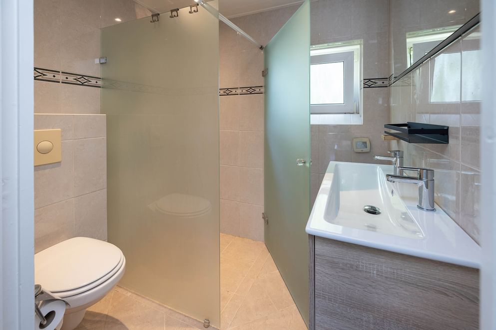 De overloop biedt toegang tot drie slaapkamers, waarvan twee zijn voorzien van vaste kasten. De nette badkamer beschikt over een inloopdouche, wastafelmeubel met dubbele kraan en een vrijdragend toilet.
