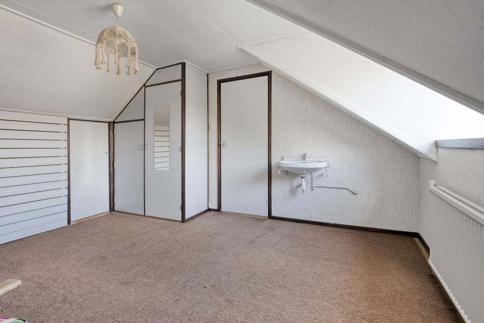 De tweede verdieping is bereikbaar via een vaste trap. Vanaf de overloop heb je toegang tot een extra slaapkamer, de stookruimte en een bergkamer. De slaapkamer is voorzien van een dakkapel, een wastafel en vaste kasten.