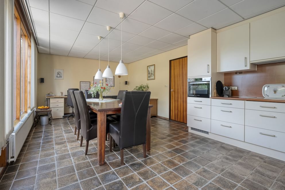 Bij binnenkomst via de entree tref je een ruime vaste kast, de meterkast, het toilet, de trapopgang naar de eerste verdieping en de deur naar de woonkamer. De woonkamer biedt toegang tot de keuken, die ruim is opgezet en voorzien van diverse inbouwapparatuur, waaronder een combi-oven, een 4-pits keramische kookplaat, een afzuigkap en een vaatwasser. Vanuit de keuken is er een loopdeur naar het terras en een doorgang naar de garage. De achtertuin is geheel betegeld en daardoor zeer onderhoudsvriendelijk.