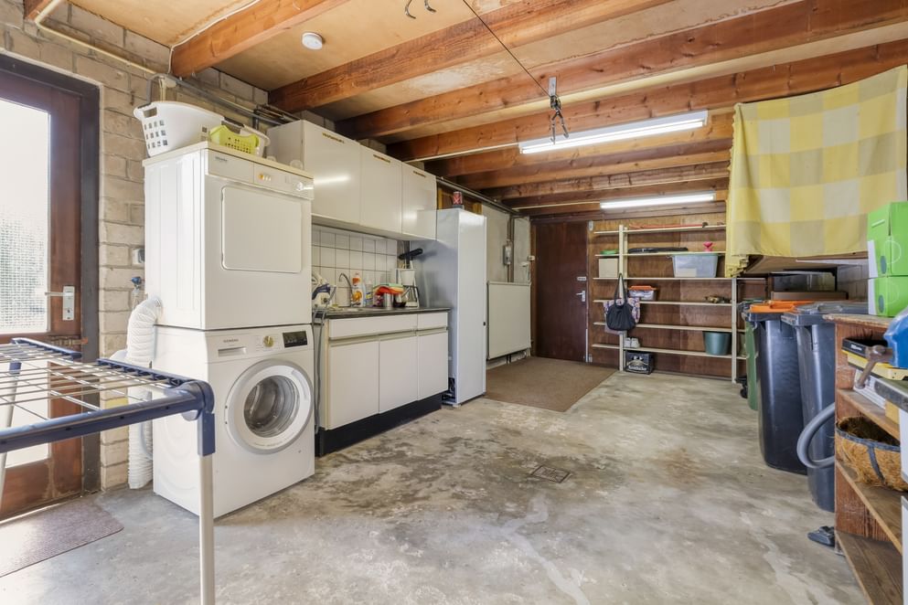 De garage beschikt over een keukenblok met een rvs-spoelbak, een aansluiting voor witgoed, een loopdeur naar de achtertuin en een deur naar de carport aan de voorzijde van de woning.