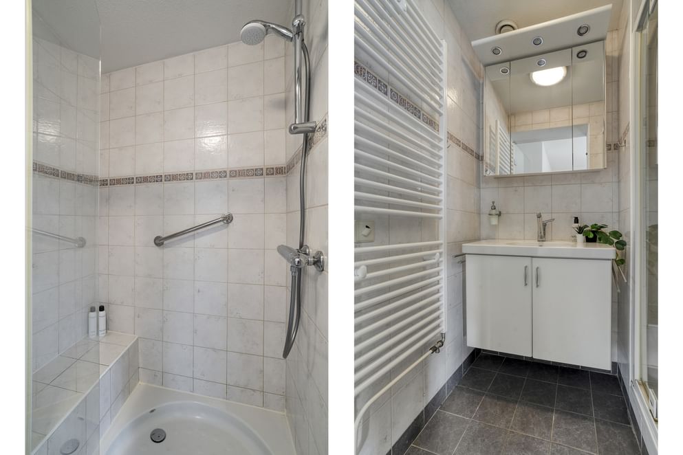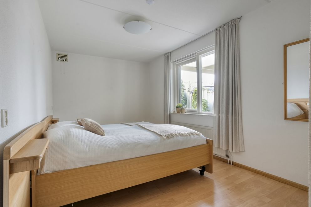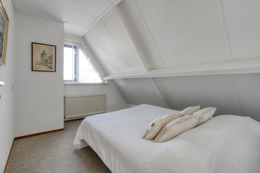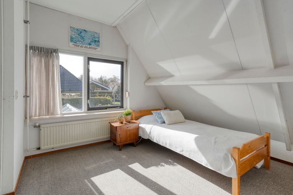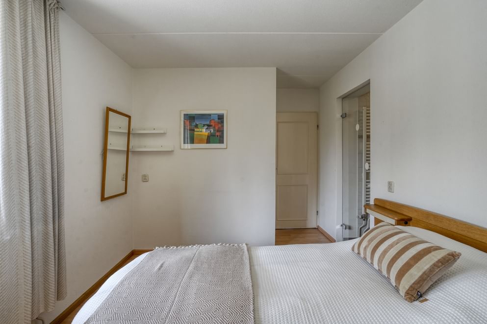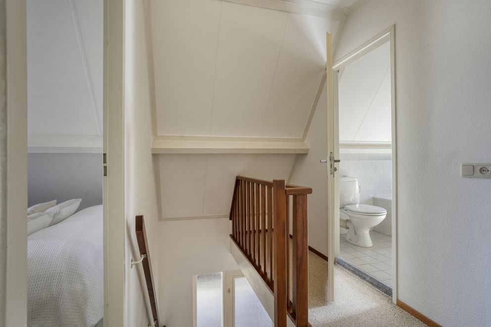 Vanaf de overloop heb je toegang tot drie slaapkamers, waarvan één voorzien van een praktische vaste kast. Daarnaast bevindt zich op de overloop een extra bergkast, ideaal voor het opbergen van spullen. De badkamer is compleet uitgevoerd en beschikt over een wastafel, ligbad, inloopdouche en toilet.