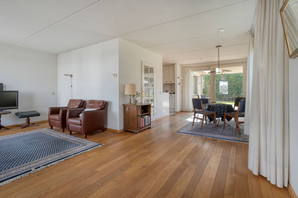 Vanuit de Hal loop je de royale en lichte woonkamer in die in directe verbinding staat met de open keuken. De grote schuifpui vormt een prachtige verbinding met buiten en geeft direct toegang tot het overdekte terras. Dankzij de lichtstraat baadt deze plek in natuurlijk daglicht. Een sfeervolle setting om in alle rust de dag af te sluiten.