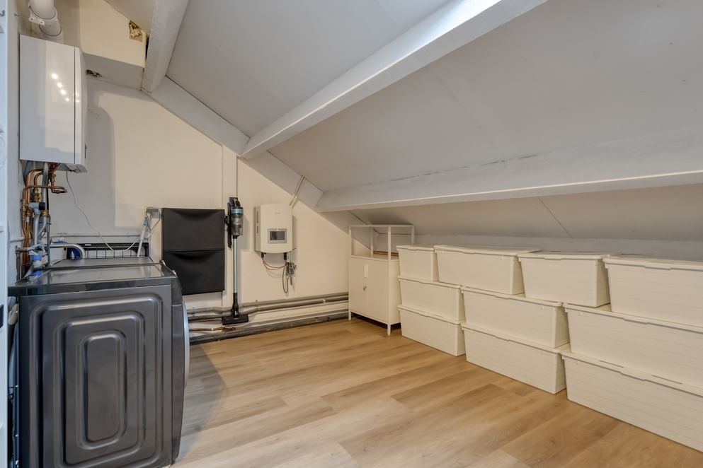 De tweede verdieping is bereikbaar via een vaste trap. De ruime overloop is voorzien van een witgoedaansluiting en een dakraam, en biedt volop bergruimte achter de knieschotten. Vanuit de overloop kom je in een multifunctionele ruimte, die uitstekend geschikt is als vierde slaapkamer, werk- of hobbykamer. Deze ruimte is royaal opgezet en beschikt bovendien over airconditioning.