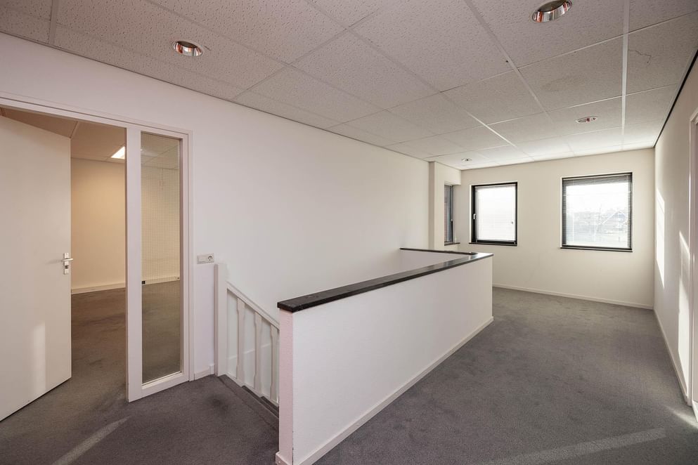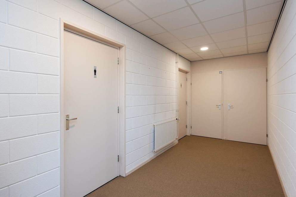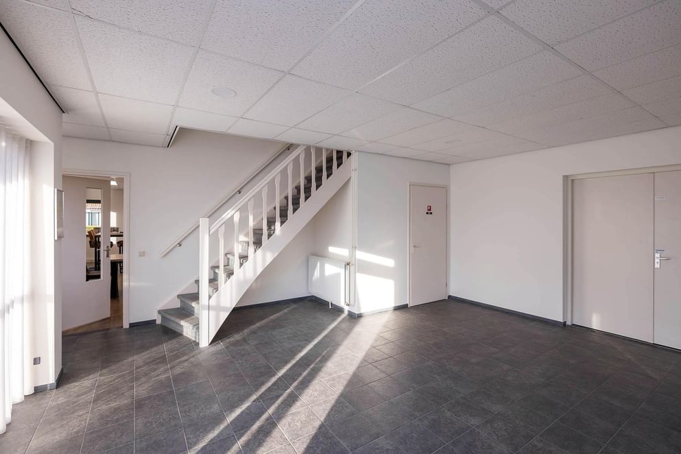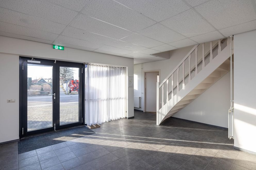 De gezamenlijke entree geeft toegang tot de kantine/keuken, verblijfsruimte en vaste trap. De vaste trap leid naar de eerste verdieping met overloop, toilet, cv-ruimte en de twee kantoorruimtes.