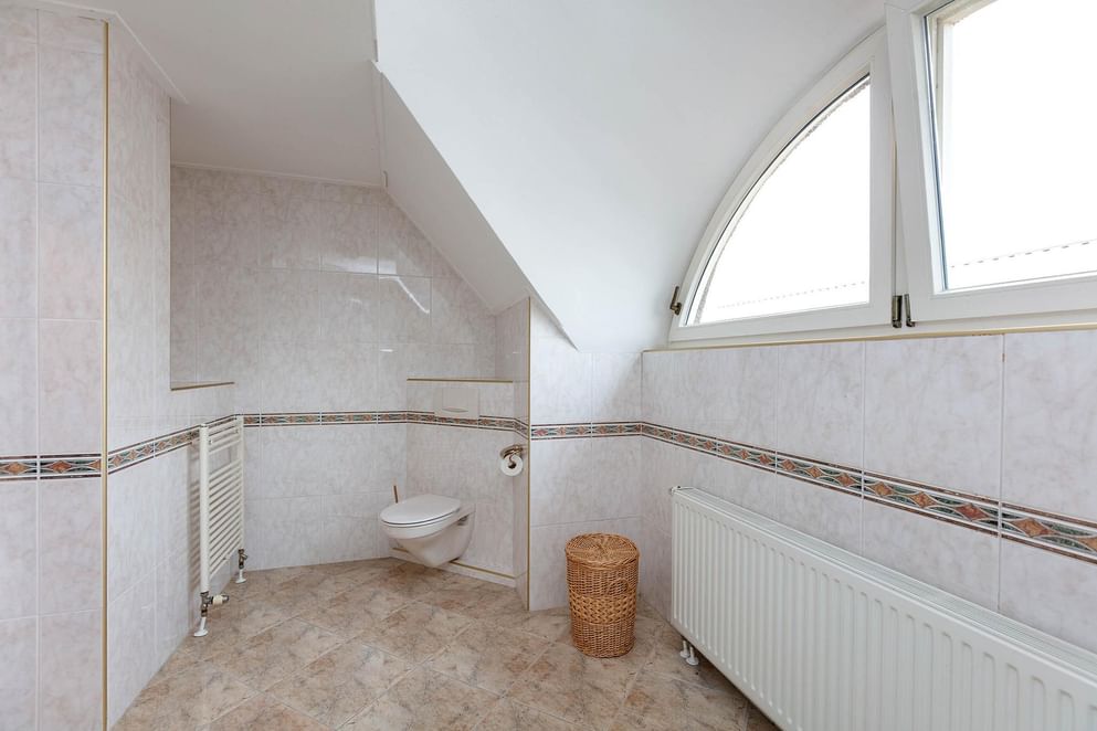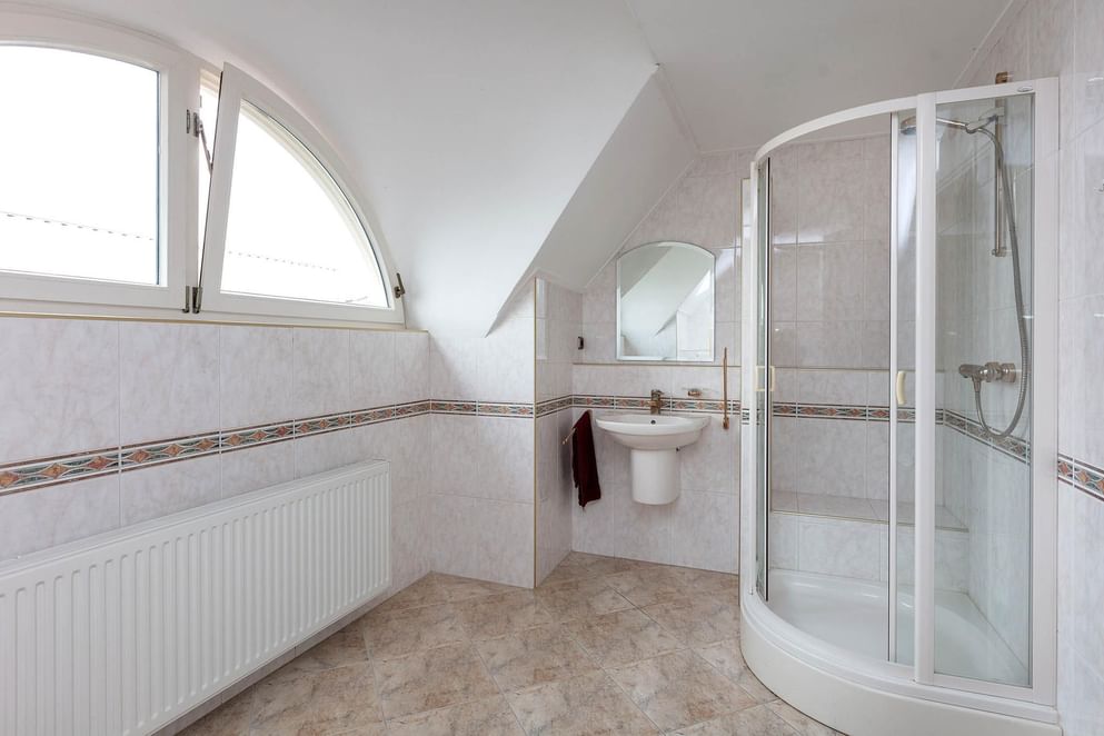 Overloop, twee ruime slaapkamers welke beide zijn v.v. een vaste kastenwand en extra bergzolder, badkamer v.v. douche, toilet, wastafel en designradiator. Een van de bergzolders kan eenvoudig worden omgeturnd tot een ruime derde slaapkamer.
