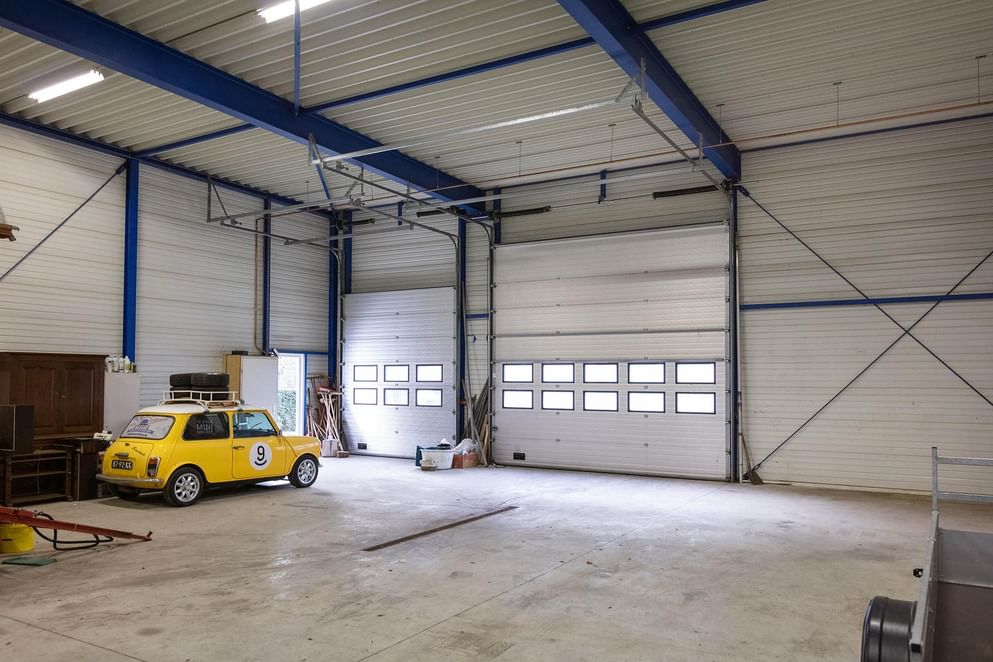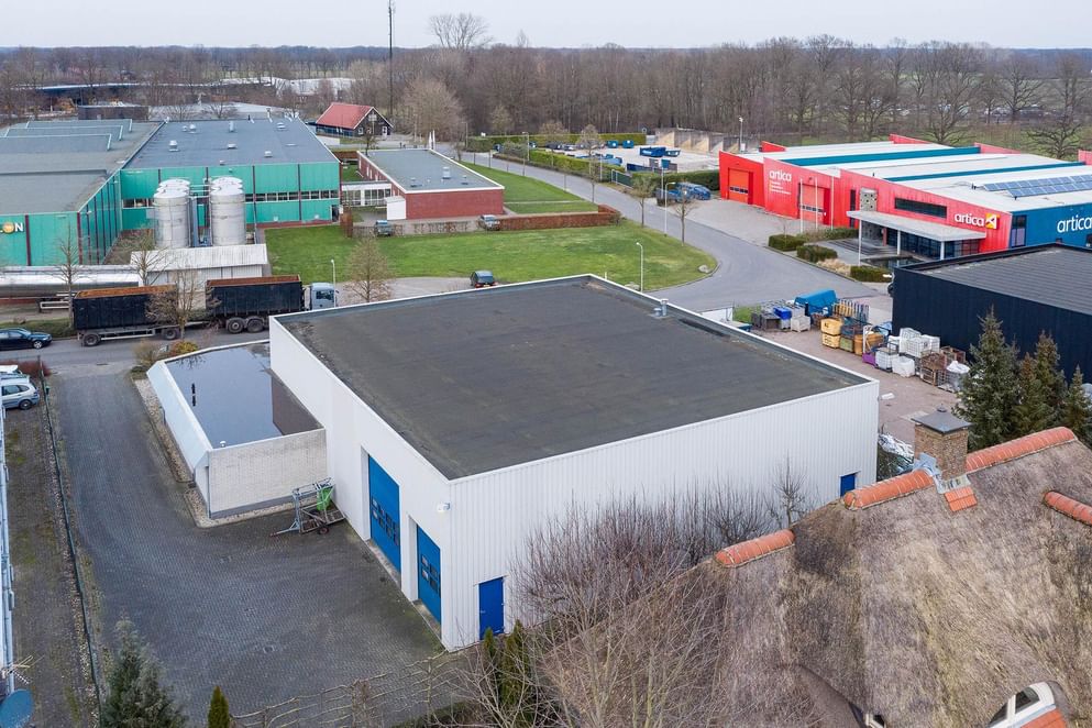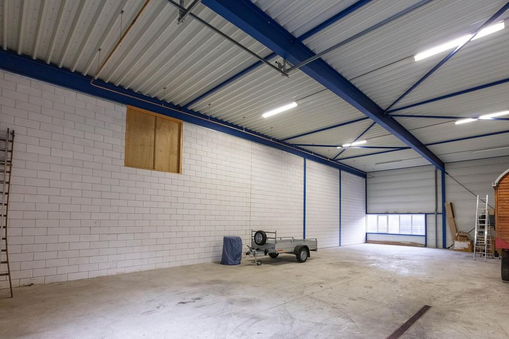 Hal van ca. 285 m² v.v. betonvloer, stalen spanten, geïsoleerde binnendoos, damwand buitenbeplating, krachtstroom, kunststof kozijnen, twee overheaddeuren en twee loopdeuren.