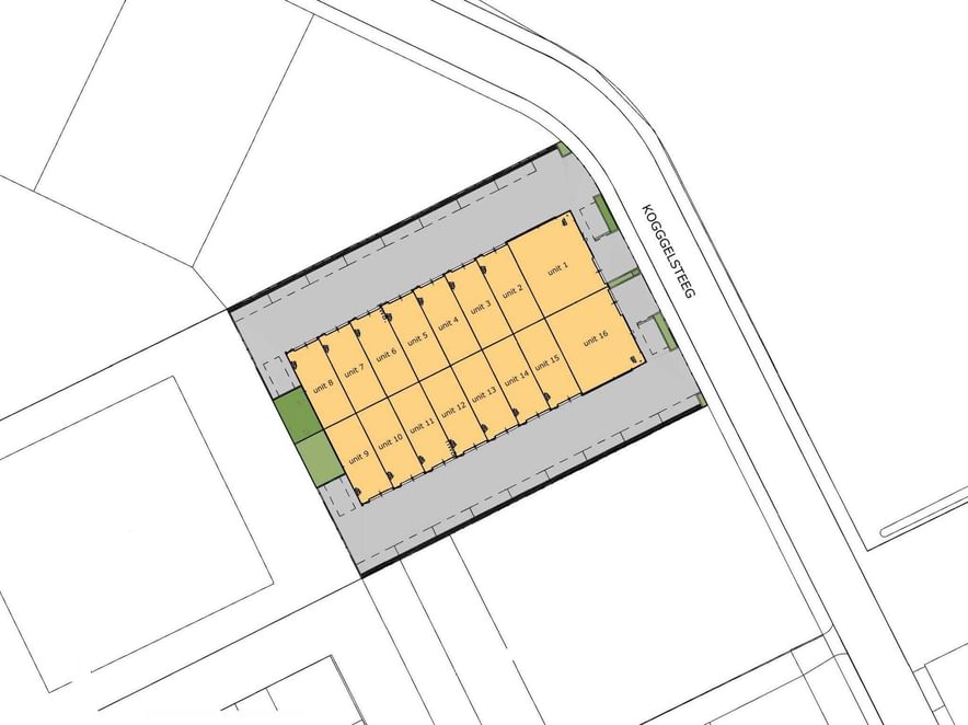 - Units worden v.v. een handbediende overheaddeur met hiernaast een loopdeur