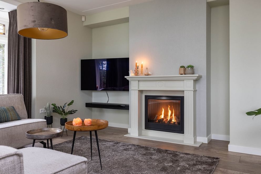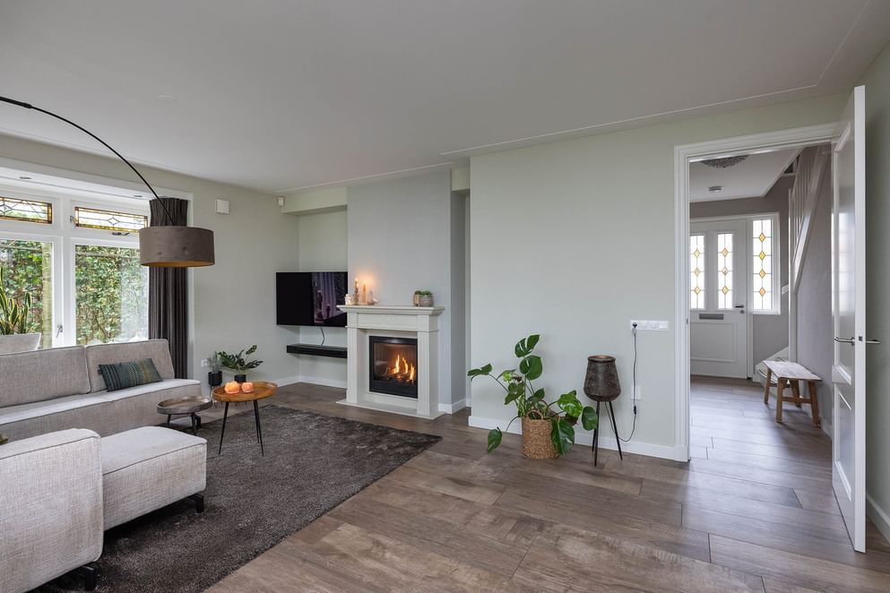 Aan de andere kant van de keuken bevindt zich een schuifpui die leidt naar de ruime en lichte woonkamer. Hier vind je nog een elektrische 'houtkachel' en een tweede schuifpui die toegang biedt tot de gezellige tuinkamer. Vanuit de tuinkamer stap je eveneens zo de achtertuin in. De woonkamer sluit tot slot weer aan op de entreehal, wat zorgt voor een prettige en logische indeling van het geheel.