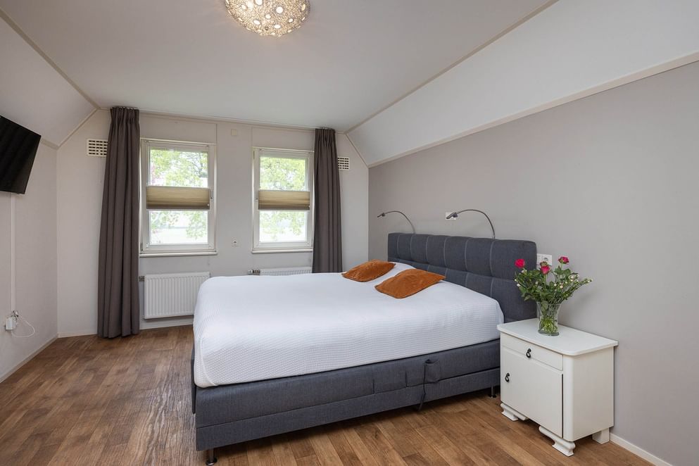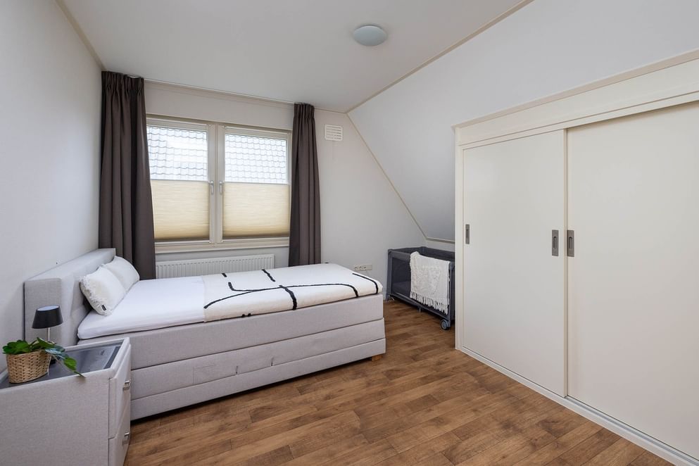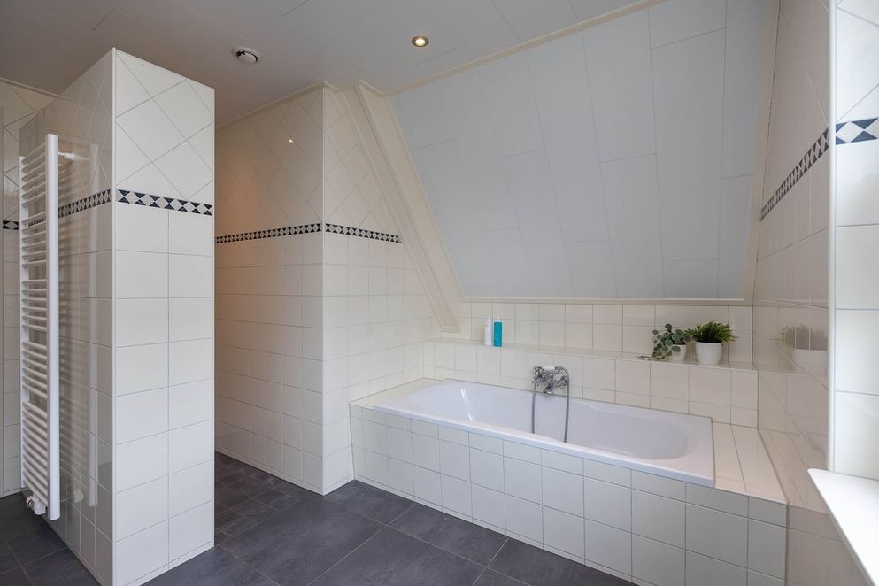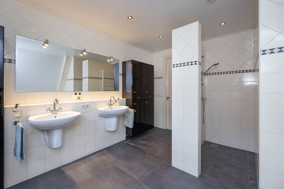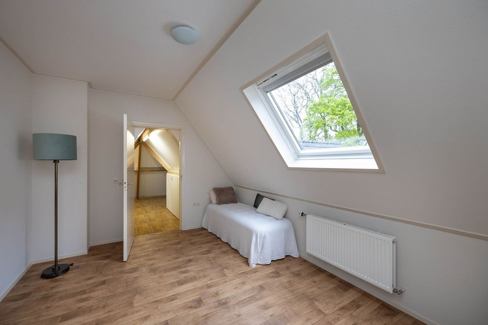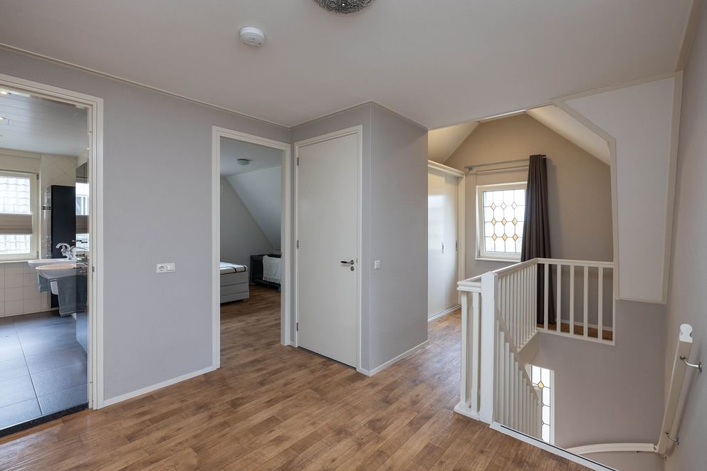 Vanaf de ruime overloop zijn vier slaapkamers, een apart toilet en de badkamer toegankelijk. Alle slaapkamers beschikken over vaste kasten, net als de overloop, wat zorgt voor extra opbergruimte. Achter de vaste kasten op de overloop bevindt zich een aansluiting voor witgoed. De zolder, gelegen op de eerste verdieping, is te bereiken via een van de slaapkamers en is eveneens voorzien van een praktische vaste kastenwand. De badkamer is compleet ingericht met een inloopdouche, een ligbad en een dubbele wastafel.