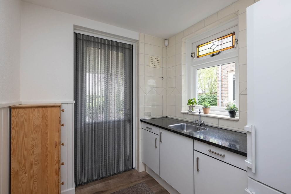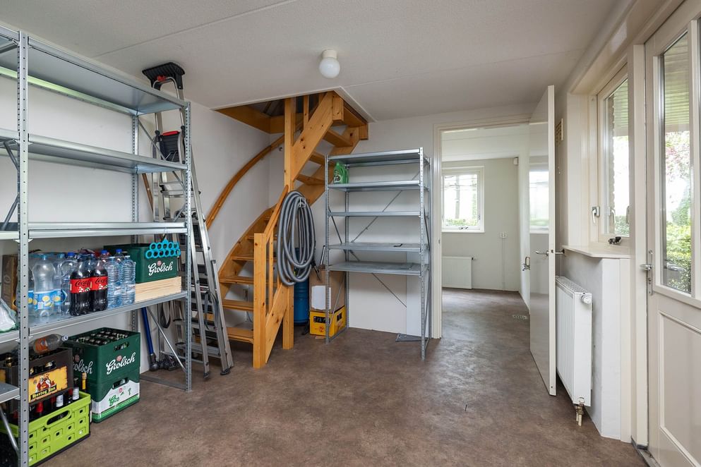 Via de keuken bereik je de praktische bijkeuken, die is uitgerust met een extra spoelbak, een tweede koelkast en een vriezer. Vanuit hier heb je toegang tot de achtertuin, de berging en een extra deur die leidt naar de voorkant van de woning. De berging geeft bovendien toegang tot een extra kamer die volledig naar eigen wens is in te richten en geschikt is voor diverse doeleinden. De berging beschikt daarnaast over openslaande deuren naar de carport.