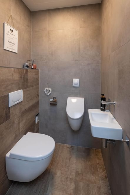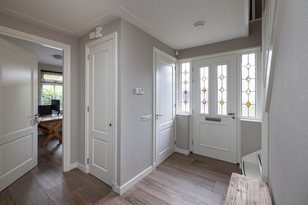 Bij binnenkomst in de woning stap je in een ruime entree met toegang tot diverse vertrekken. Hier vind je de trapopgang naar de eerste verdieping, een modern toilet met fonteintje en urinoir, de meterkast en deuren naar de woonkamer, de keuken en een extra kamer. Deze extra kamer is ideaal te gebruiken als werk- of speelkamer.