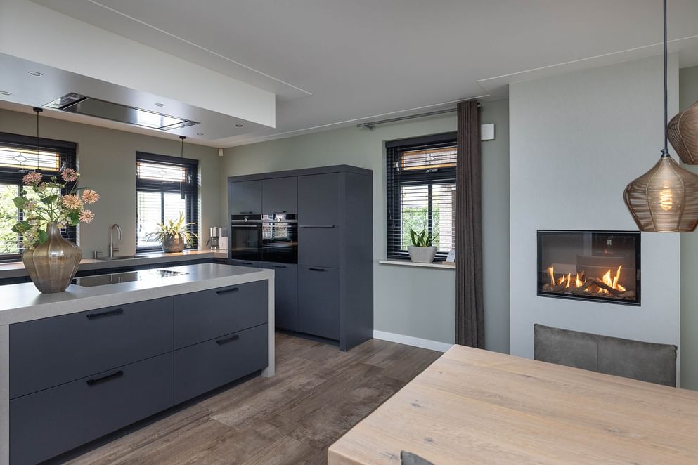 De sfeervolle open keuken is voorzien van een kookeiland en diverse inbouwapparatuur, waaronder een inductiekookplaat, afzuigkap, oven, magnetron, steamer, koelkast, vriezer en vaatwasser. Er is ook een gezellige elektrische haard aanwezig, en dankzij de royale opzet is er voldoende ruimte voor een eettafel, waardoor de keuken tevens dienst kan doen als eetkamer. In de keuken vind je ook de provisiekelder – ideaal voor extra opslagruimte.