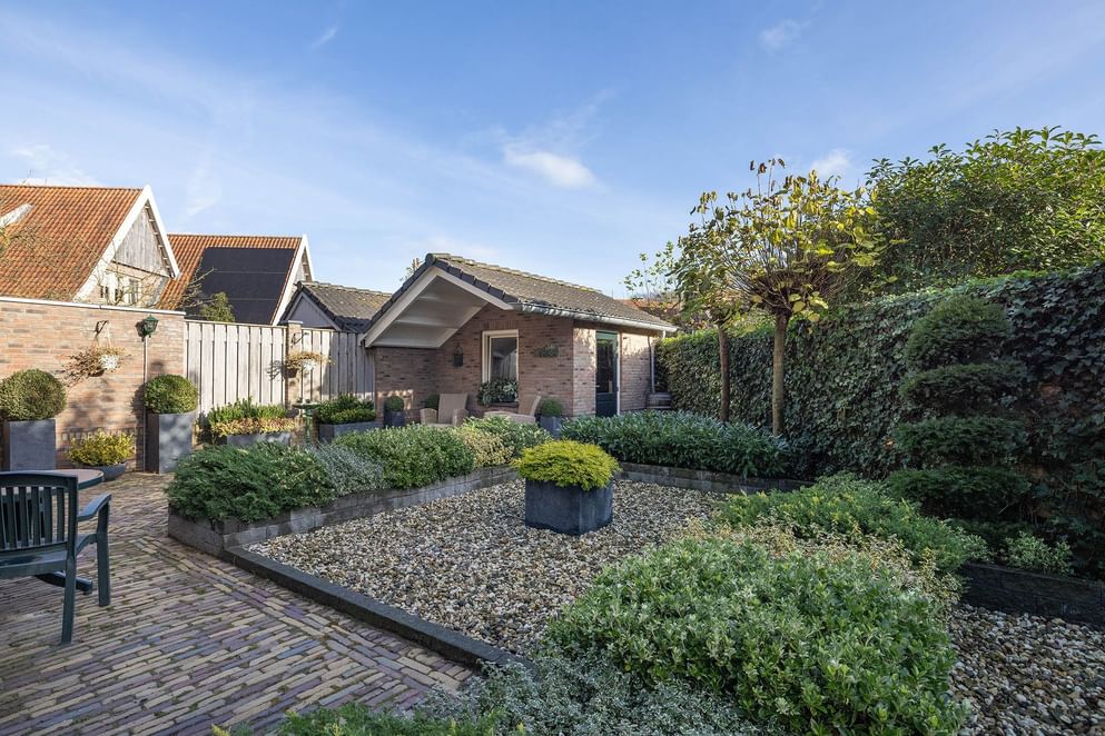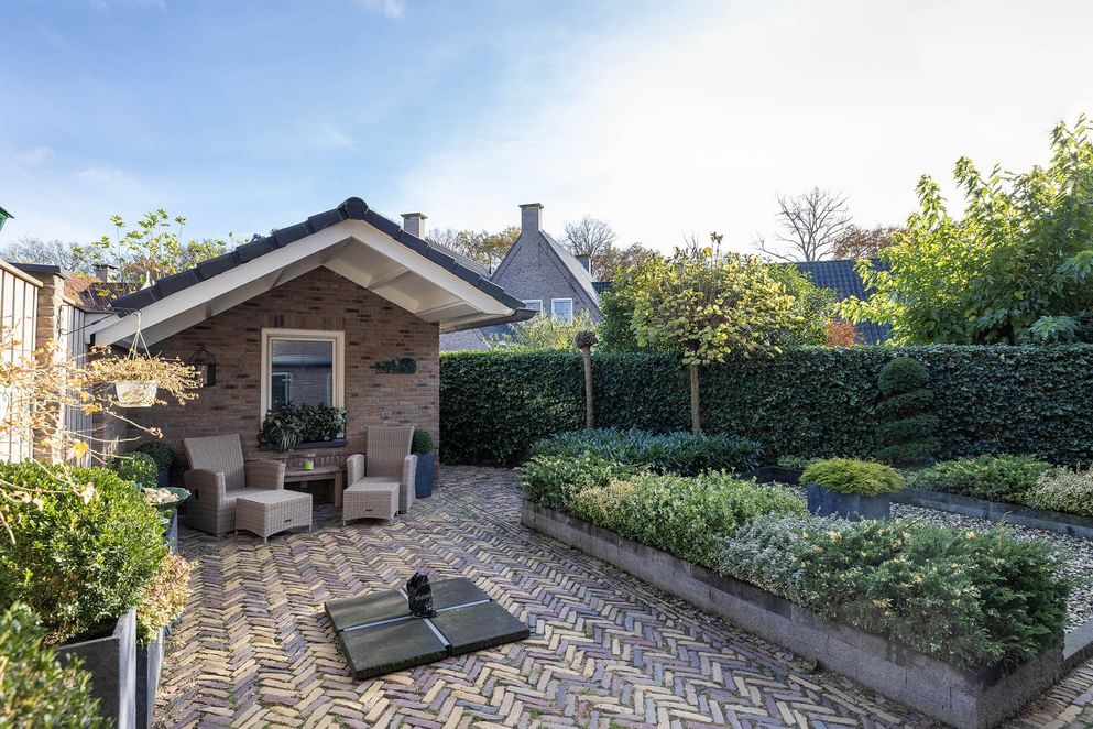 De onderhoudsvriendelijk en privacy biedende achtertuin beschikt over een fraaie gemetselde tuinberging welke is voorzien van elektra en een overdekte zit. In de zomer kun je in de achtertuin tevens genieten onder de elektrisch bedienbare, royale zonnescherm. Via de poort lopen we door naar de oprit en de tuin gelegen aan de zijkant van de woning. Parkeren op eigen terrein is mogelijk op de ruime oprit, welke plaats biedt aan minimaal twee auto's.