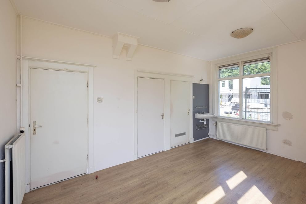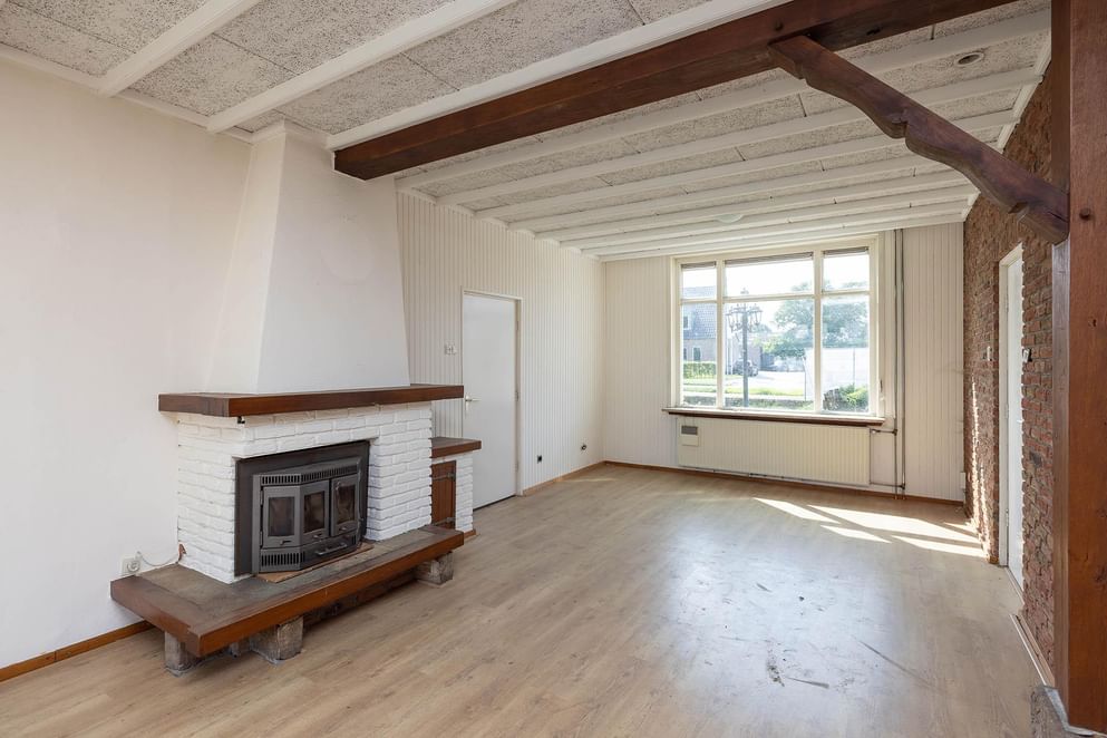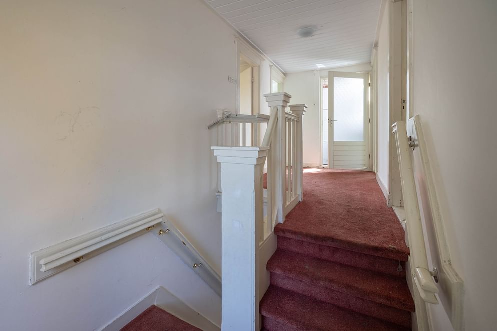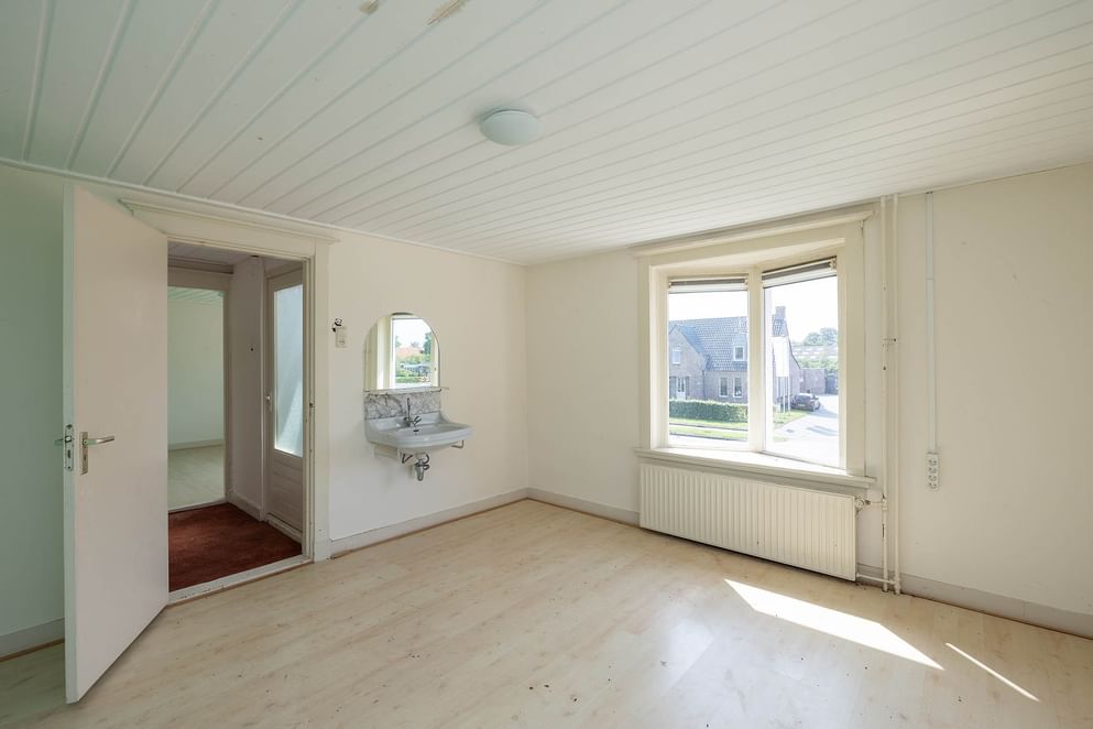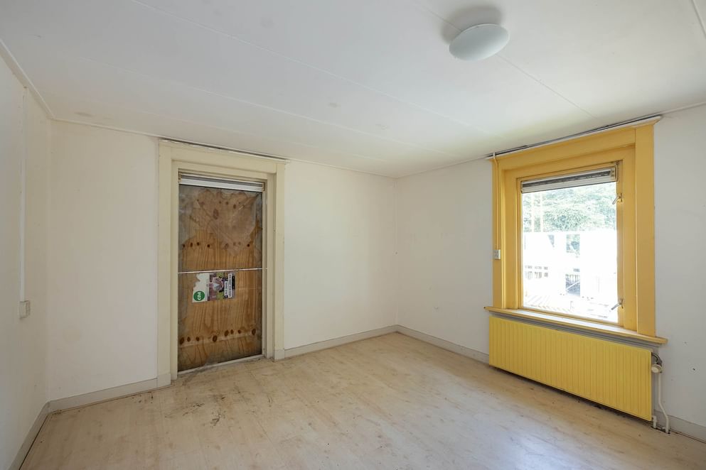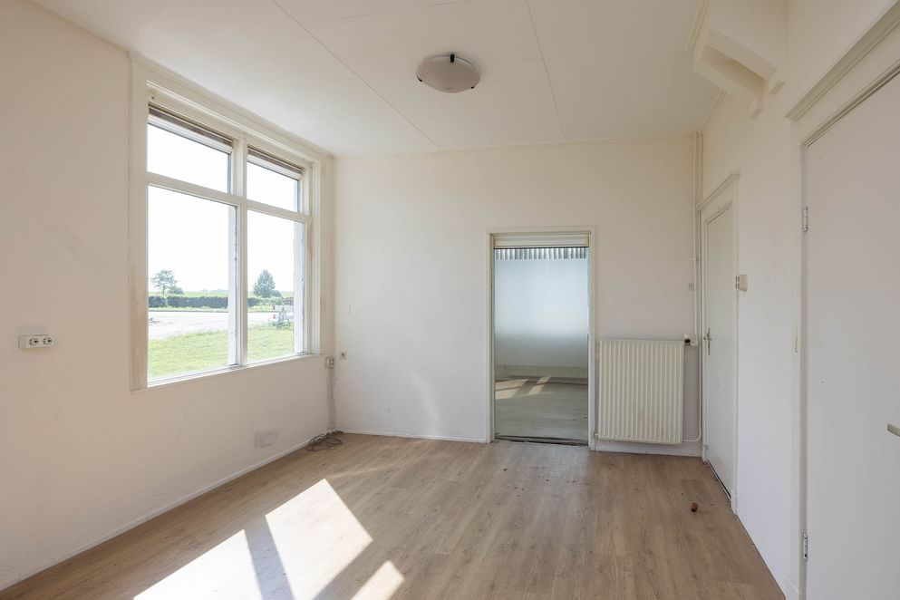 Via de voordeur kom je in de hal met trapopgang en meterkast. Aan de linker voorzijde bevindt zich een ruime woonkamer met houtkachel. Aan de rechter kant zijn er nog twee kamers. Deze lenen zich uitstekend als toekomstige keuken of werkruimte. Achter in de hal, onder de trap, bevinden zich de toegangen tot het toilet en de kelder.