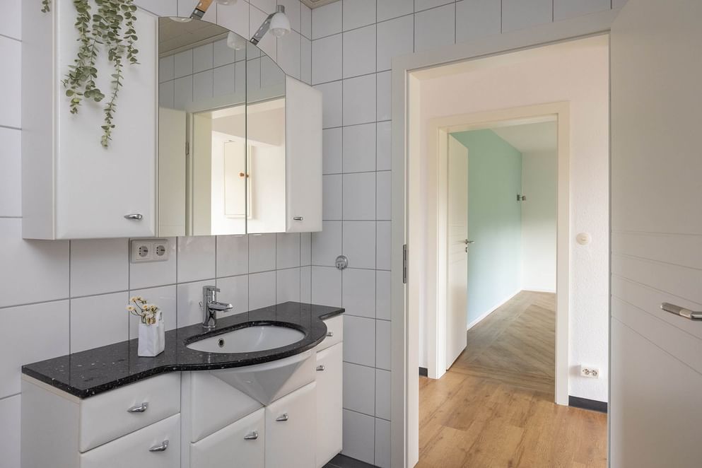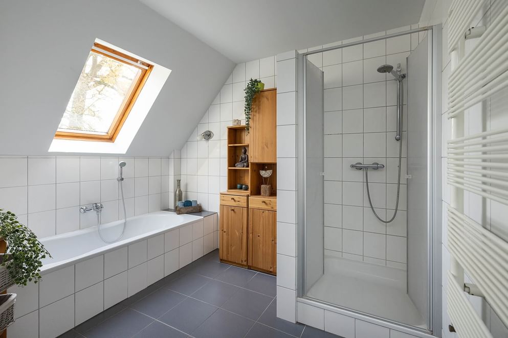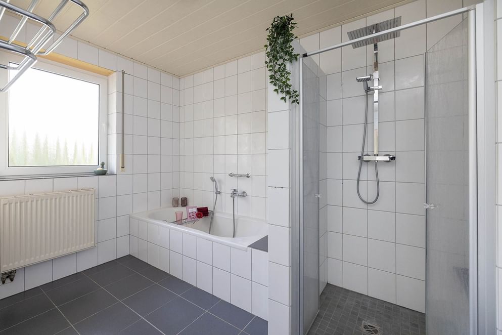De overloop biedt toegang tot een tweede badkamer, compleet uitgerust met ligbad, douche, wandcloset en wastafel. Daarnaast vind je hier een tweede woonkamer en een ruime keuken, wat deze verdieping zeer geschikt maakt voor dubbele bewoning of mantelzorg.