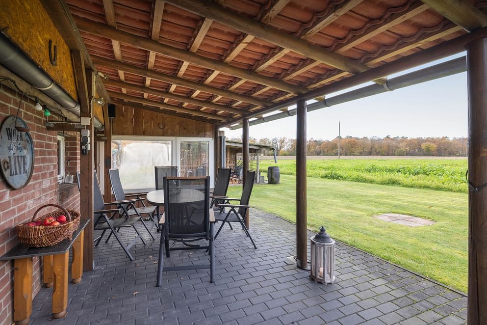 De tuin rondom de woning is royaal opgezet en biedt volop mogelijkheden voor tuinliefhebbers, rustzoekers en buitenmensen. Aan de achterzijde vind je een fijne overkapping met weids uitzicht over het omliggende platteland – een heerlijke plek om te genieten van de ochtendzon of lange zomeravonden.