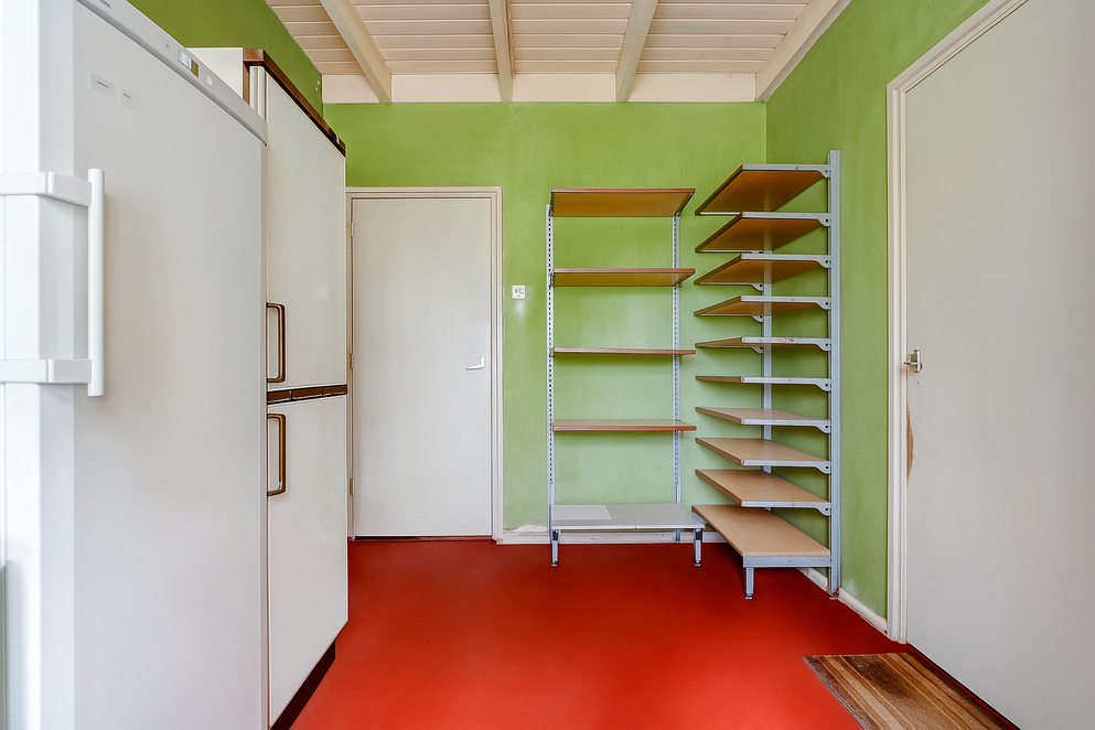 Tegenover de keuken bevindt zich een praktische bijkeuken met aansluitingen voor de wasmachine en droger, een apart toilet en extra bergruimte. Aangrenzend aan de bijkeuken is een berging aanwezig, ideaal voor extra opslag. Aan het einde van de hal bevindt zich een tweede buitendeur, waardoor je ook aan de achterzijde van de woning naar buiten kunt.