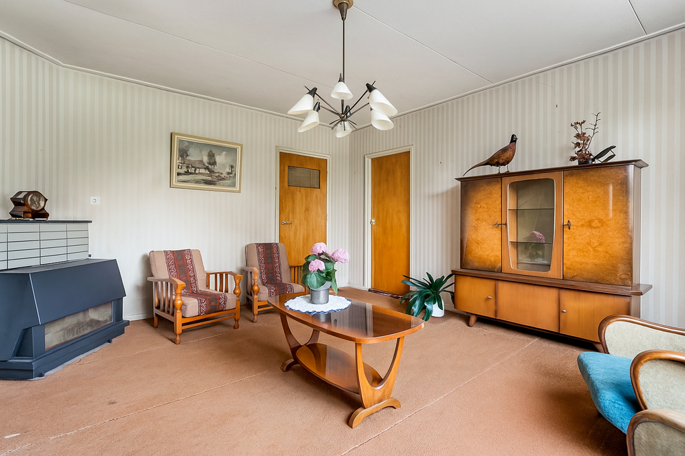 Bij binnenkomst betreed je een centraal gelegen hal die toegang biedt tot alle vertrekken in de woning. Aan de rechterzijde bevinden zich twee slaapkamers, achter elkaar gelegen. Aan de linkerzijde van de hal kom je in de voorkamer, die flexibel is in te richten als bijvoorbeeld kantoor, speelkamer of extra slaapkamer. Aansluitend aan deze multifunctionele ruimte bevindt zich de woonkamer, die ook rechtstreeks vanuit de hal te bereiken is. De woonkamer is licht en ruim en staat via dubbele openslaande deuren in directe verbinding met de royale woonkeuken. De keuken is ruim opgezet en biedt volop plaats voor een grote eettafel.