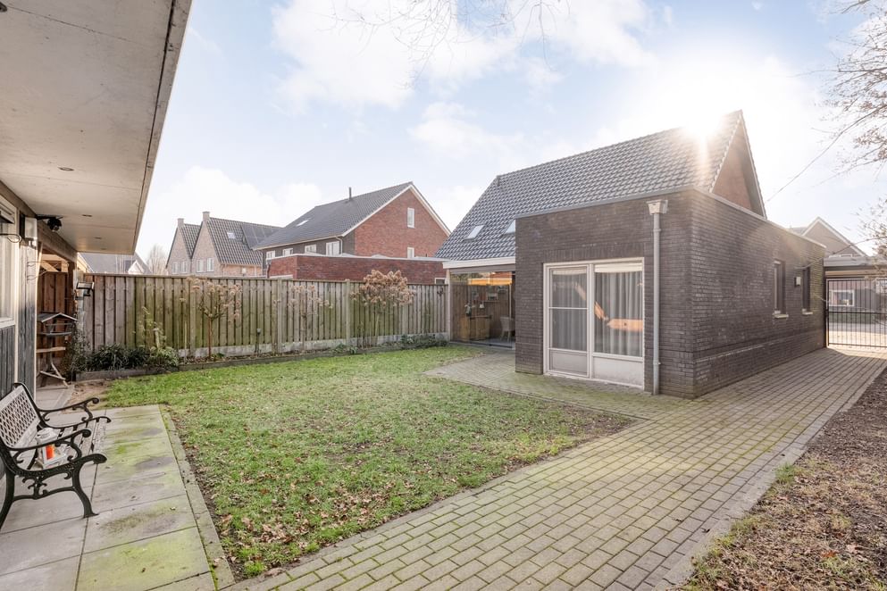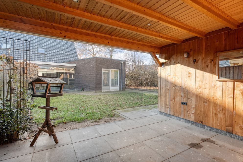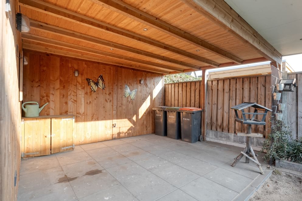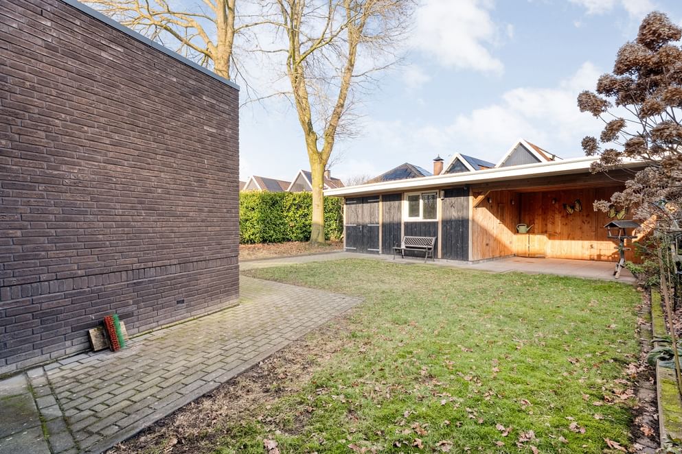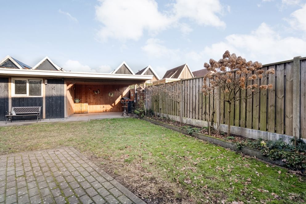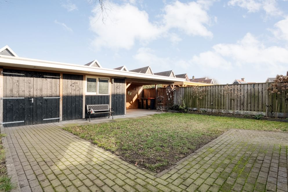 De tuin is onderhoudsvriendelijk aangelegd en beschikt over een fraaie grasstrook. Achterin de tuin bevindt zich een vrijstaande stenen berging, ideaal voor extra opbergruimte. Aansluitend aan de berging is een overkapping gerealiseerd: een perfecte plek voor het stallen van fietsen en de otto's of het creëren van een extra zitgelegenheid.